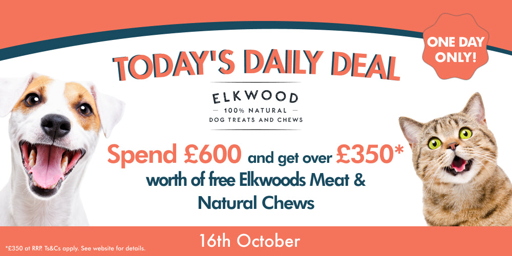 TODAY'S DAILY DEAL | Spend £600 and get over £350* worth of free Elkwoods Meat & Natural Chews | SHOP NOW |