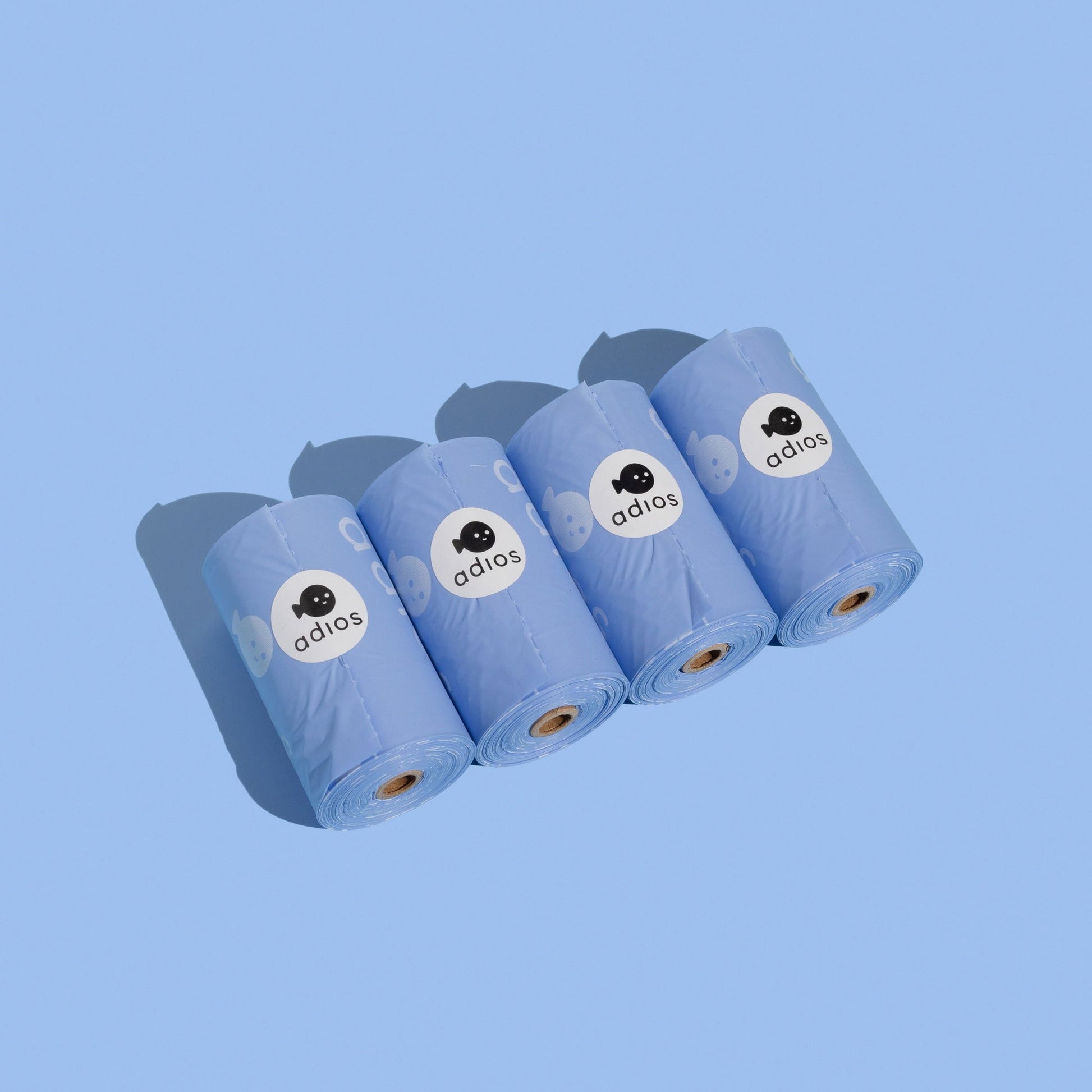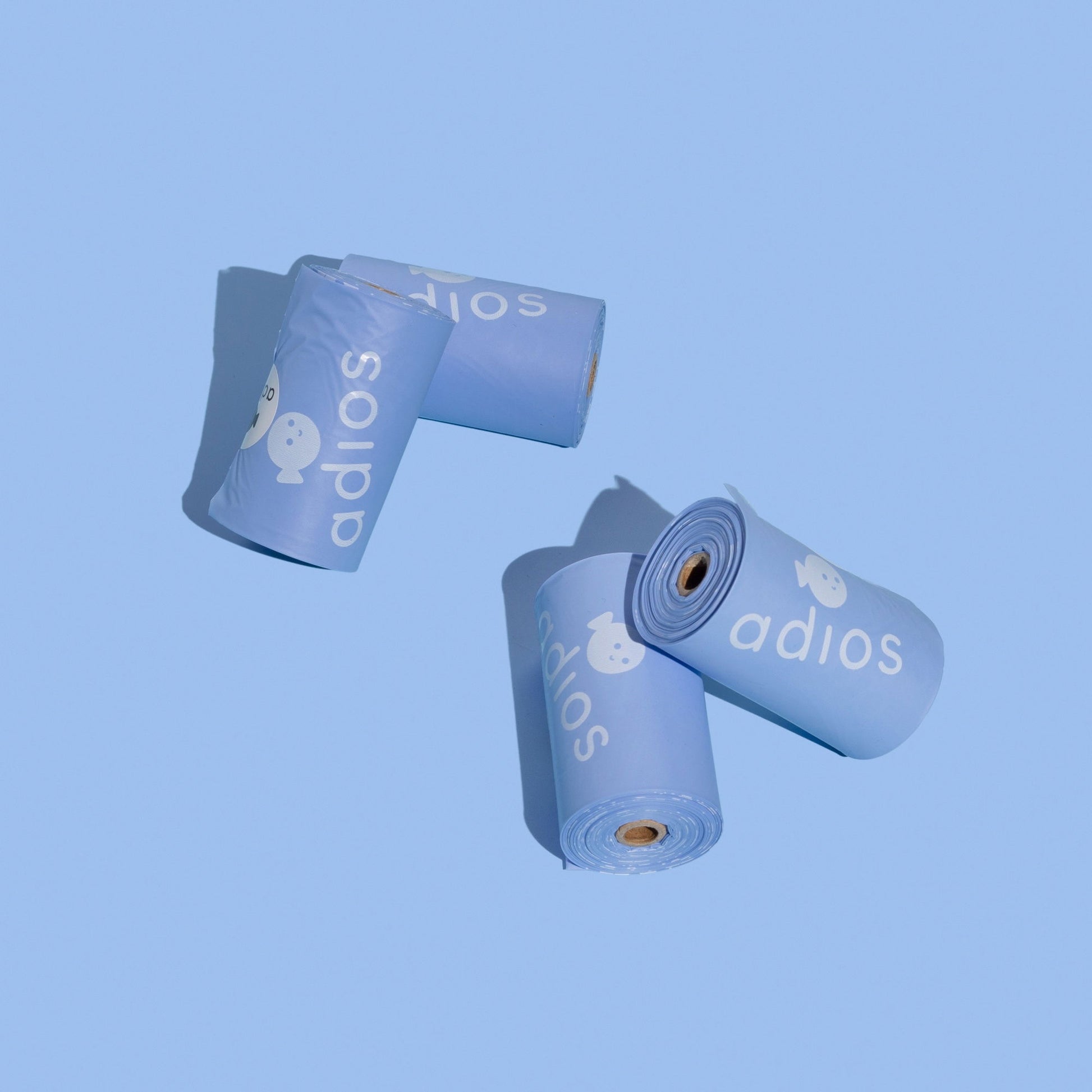 Adios dog poo bags are plant-based, compostable and extra thick. Certified HOME compostable Made from natural materials Extra thick & easy to open No microplastics 15 bags to a roll Blue colour