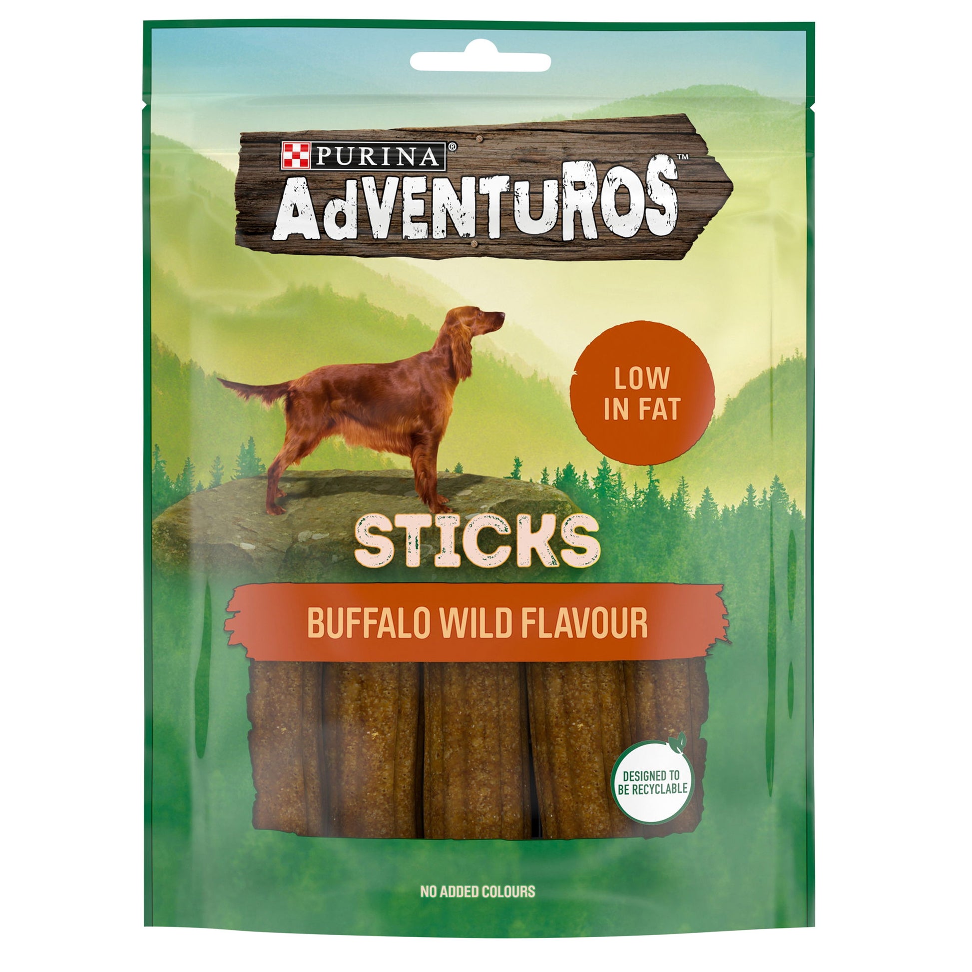 Made for dogs with a nose for adventure, PURINA® AdVENTuROS™ dog treats are packed with exciting flavours just waiting to be unleashed. Purina® AdVENTuROS™ Sticks are rough outside, soft inside and full of mouth-watering buffalo wild flavour, they’re everything your dog loves about freedom and the great outdoors. Fire your dog’s imagination with Purina AdVENTuROS™ Sticks and let a new wild adventure begin. Purina® AdVENTuROS™ comes in a resealable bag, helping to keep them fresh