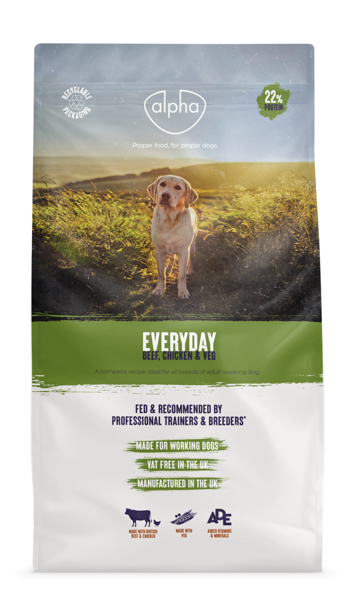 NO-NONSENSE, EVERYDAY HEALTH. Alpha Everyday contains beef, chicken & veg. It is a nutritionally complete and balanced food for all breeds of adult dog.