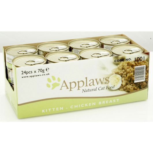 Kitten Chicken 50% eggs 5% tuna liver 3% fish oil .1% sunflower oil 1.5% cooking water 39.4% rice 1% applaws natural cat food that contains nothing more than the ingredients listed on the tin.The chickens are fed on completely organic feed and are entirely hormone free. No artificial colours, flavours, preservatives, taste enhancers or additives. A well balanced food for a new kitten.