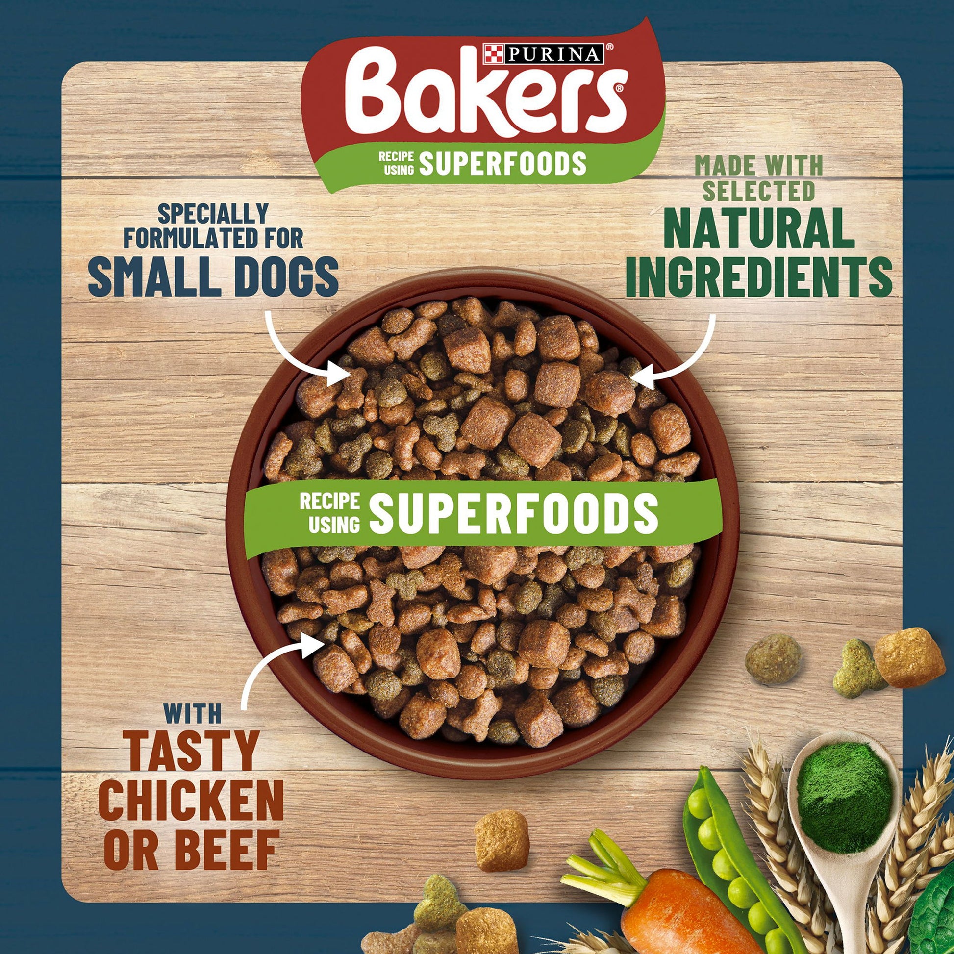 Our recipe has been made with a variety of tender meaty chunks and wholegrains for quality, tasty goodness. Each meal contains the every day nutrients your dog needs to get on with all the playful and cheeky things that happy and healthy Bakers dogs do!