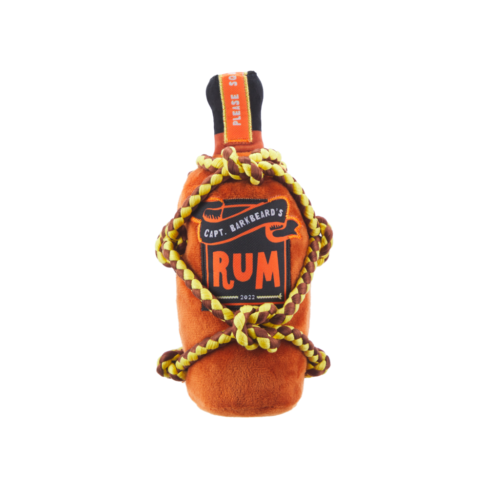 Yo, ho, ho! Throw this bottle of rum dog toy! Grab hold of the T-Shirt rope and try not to cast off! Barkbeard's Rum is packed with fluff and a deep squeaker, so you'll have to put your whole booty into tugging if you want to steal a swig from yer best matey. Bottoms up, pup! FEATURES: BARK Barkbeard's Rum brown pirate rum bottle plush dog toy Made with T-shirt rope for tugs of fun. Made with a deep, grunt squeaker that's easy on the ears. Packed with fluff for mouthfuls of fun. Made with T-shirt rope for tugs of fun.Yo, ho, ho! Throw this bottle of rum dog toy! Grab hold of the T-Shirt rope and try not to cast off! Barkbeard's Rum is packed with fluff and a deep squeaker, so you'll have to put your whole booty into tugging if you want to steal a swig from yer best matey. Bottoms up, pup! FEATURES: BARK Barkbeard's Rum brown pirate rum bottle plush dog toy Made with T-shirt rope for tugs of fun. Made with a deep, grunt squeaker that's easy on the ears. Packed with fluff for mouthfuls of fun. Made with T-shirt rope for tugs of fun.