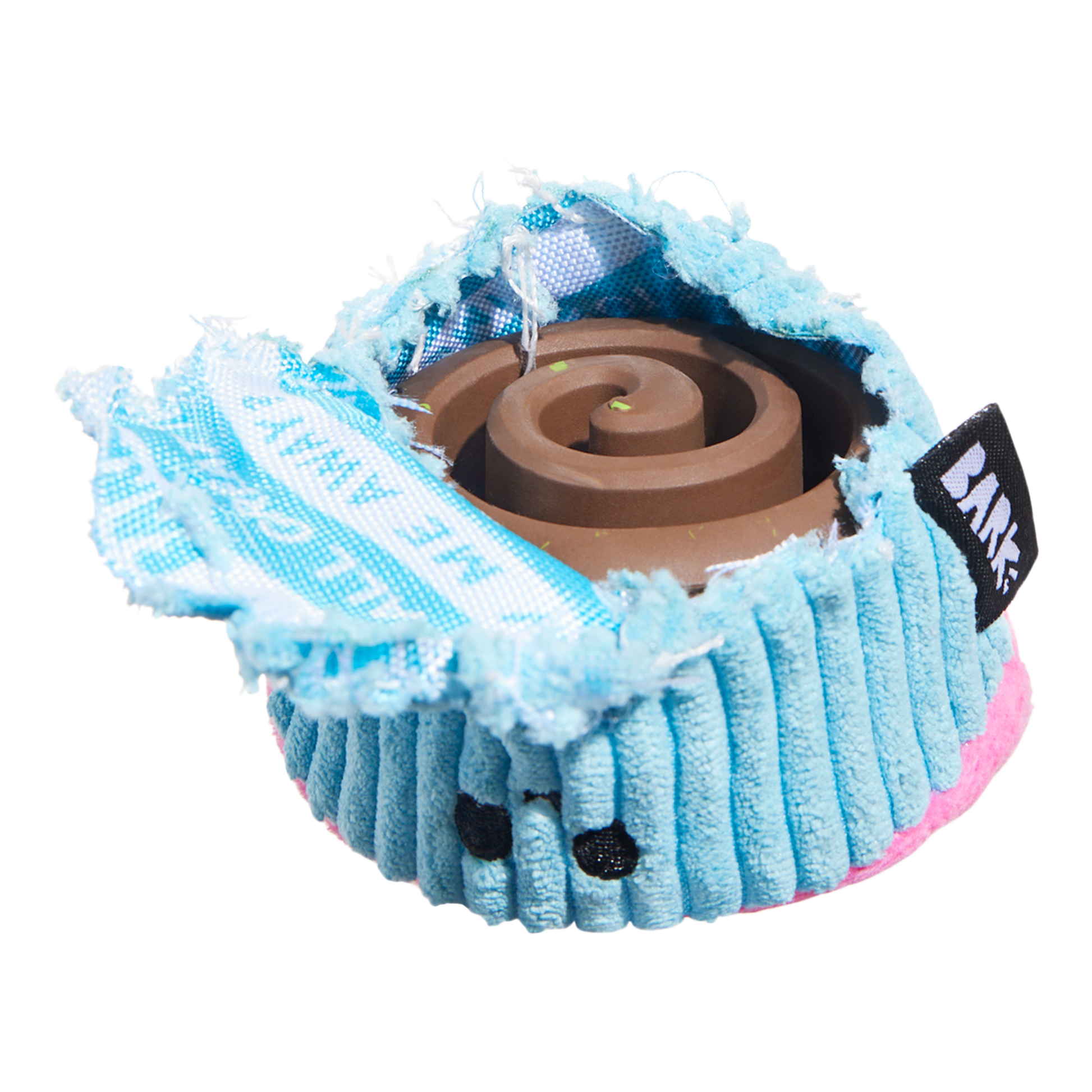 She may look sweet on the outside, but on the inside this cupcake dog toy is one tough confurction! Rip the outer fabric to reveal a tough cake core that’s perfect for hiding treats and spreading peanut butter or yogurt. This internal toy also features a wobbly bounce for challenging chasing. Cup Cake just makes playtime batter, because all the fun is baked in!
