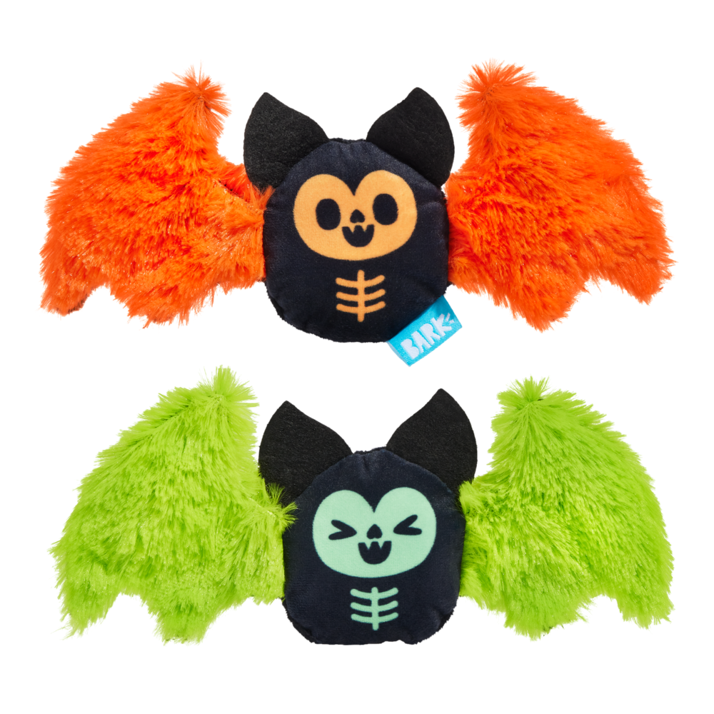 FEATURES: BARK Halloween skeleton bats plush dog toy Two squeakers because one isn't enough. Long & Strong Hair for dogs who love to shred. Crazy crinkle for a bite you can hear. Two squeakers because one isn't enough.