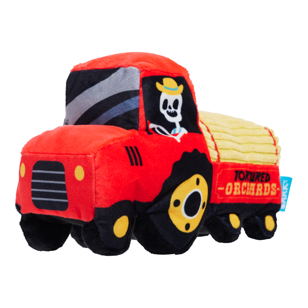 Watch out, pups! This ain't no ordinary autumn-mobile dog toy. Skeleton farmer, Oldest MacDonald is just dying to finish his chores and play with your pup. With two squeakers, crazy crinkle, and a tractor filled to the brim with fluff, his playtime work ethic screams: EEEK-I-EEEK-I-O! FEATURES: BARK Halloween undead farmer and tractor plush dog toy Two squeakers because one isn't enough. Packed with fluff for mouthfuls of fun. Crazy crinkle for a bite you can hear. Two squeakers because one isn't enough.