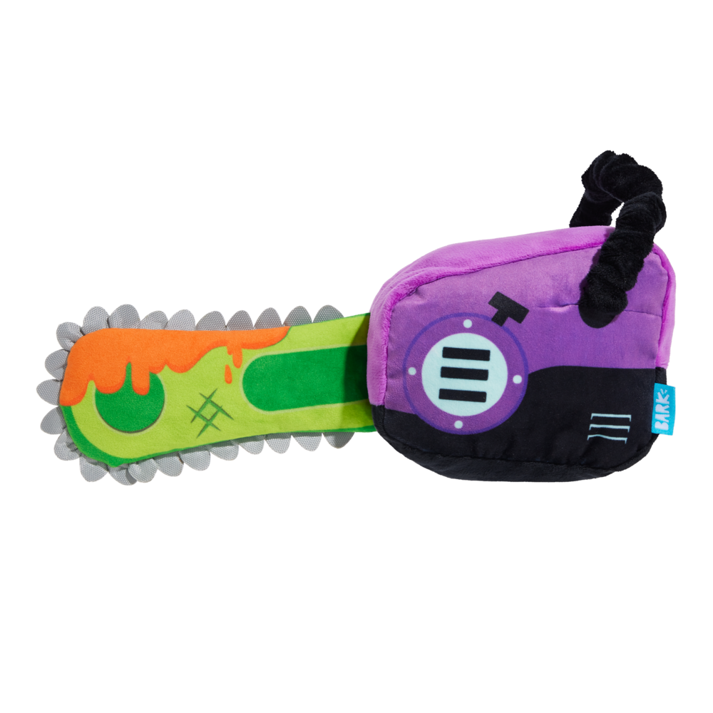 This Halloween chainsaw dog toy is great for telling urban legends or just yanking chains. Texas Chainspaw is made with a squeaker, super stretch bungee, and lots of fluff to rev-up playtime. Pose your pup with this instrument of tail-wagging torture and they'll look like they're in a thrasher film! FEATURES: BARK Halloween haunted chainsaw plush dog toy Super stretch bungee for silly, flingy, fun. Made with a squeaker for extra excitement. Packed with fluff for mouthfuls of fun. Super stretch bungee for silly, flingy, fun.