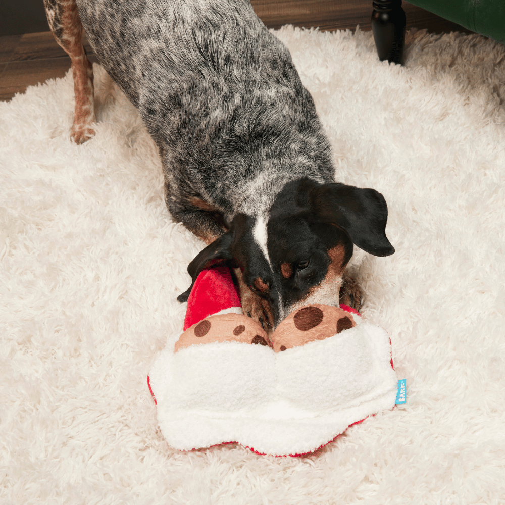 Make your pup’s Christmas wishes crumb true with Kris Krumble! This three-in-one Santa and cookie dog toy holds two squeaky cookies inside the soft and fuzzy beard. The fun doesn't stop there, dough! Give your pup more sweet surprises by hiding treats inside his beard. FEATURES: BARK Christmas white red brown Santa cookie beard plush dog toy Multi-Part Toy: 3 toys in 1 for more fun! Made with super soft fuzz—a nice mouth-feel for your mutt. Two squeakers because one isn't enough. Multi-Part Toy: 3 toys in 1 for more fun!