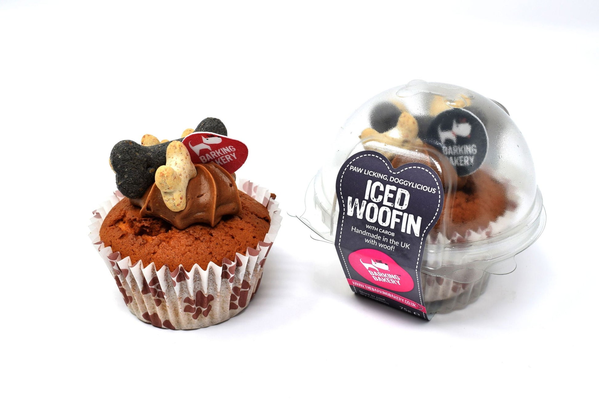 A single Vanilla Woofin with carob (dog safe chocolate) frosting. Made to share or for the larger of our furry friends...our light sponge, topped with a tail-swishing swirl of famous yoghurt frosting and decorated with crunchy doggy bone biscuits and edible disc. In a cute paw print muffin wrapper.