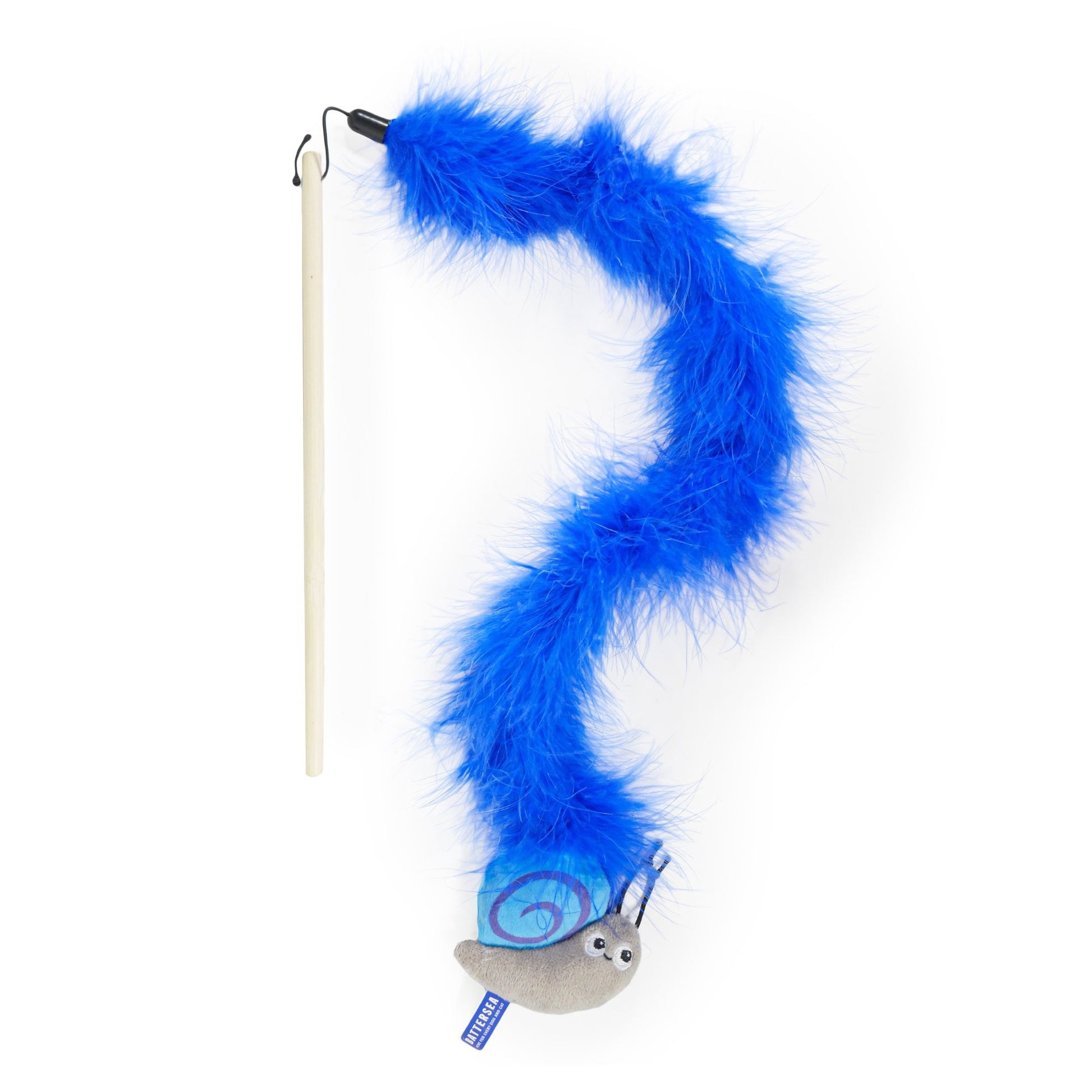 Captivating cat teaser with luxury coloured feather bower and stripe Battersea bug characters. Encourages pouncing and your cat?s natural hunting instincts, helping to keep them active. Features natural wood teaser wand.