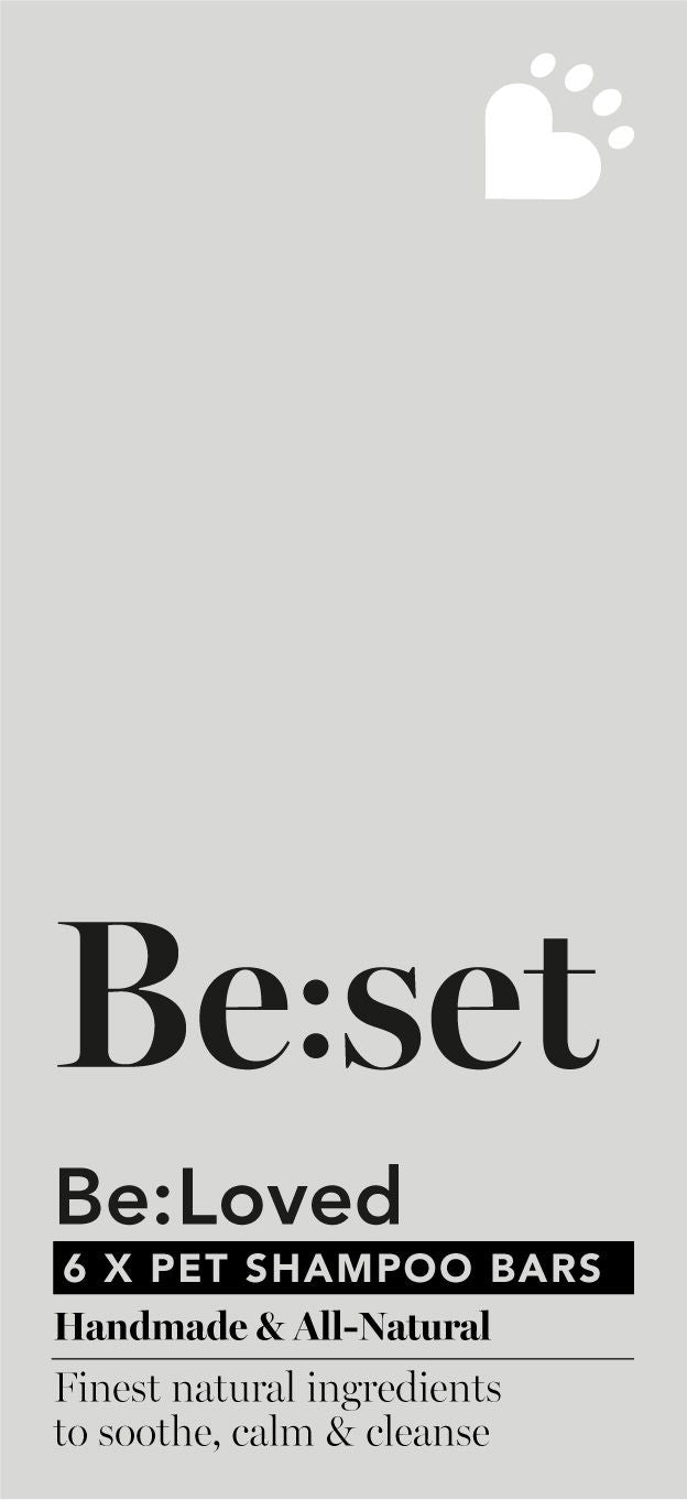 Be:Loved - our eco pledge - less packaging, less plastics, all natural. Proper pampering from palm to paw - Handmade in UK - Tested on Humans - Be:Set - 6 x 55g Shampoo Bars - Our luxury pet shampoo bars are infused with essential oils & botanicals for a gorgeous silky coat.– 1 BAR = 10-12 WASHES– ECO-FRIENDLY– CRUELTY FREE– TSA- (TRAVEL) FRIENDLY– COMPOSTABLEDIRECTIONS:Rub between wet hands to create lather or directly rub onto wet fur and hair. Gently massage into the skin and follicles, adding more water as needed. Work up a good lather and then rinse, rinse, rinse...WHEN YOU’RE DONE: Dry off the shampoo bar and store in a container away from water.WARNINGS: None, just enjoy. INGREDIENTS: Antibacterial & Cleansing: Aloe, tea tree essence, green tea extract, follicle boosters & botanicals. Calming & Moisturising: Goats milk, chamomile, lavender, rose. Soothing & Calming:Hemp, chamomile, lavender, botanicals. The Be:Loved Tale. Together, you’re two-of-a-kind. Show that you care with all-natural, handmade products that help pets to be clean, be protected and best of all, be pampered. Handpicked from hedgerows, these calming balms, soothing salves, scented shampoo bars and spritzes reassure sore paws and help nourish coats and tails to shine. Let your animals roam itch-free, odour-free, carefree. Dote on them. They deserve it. Let them Be:Loved