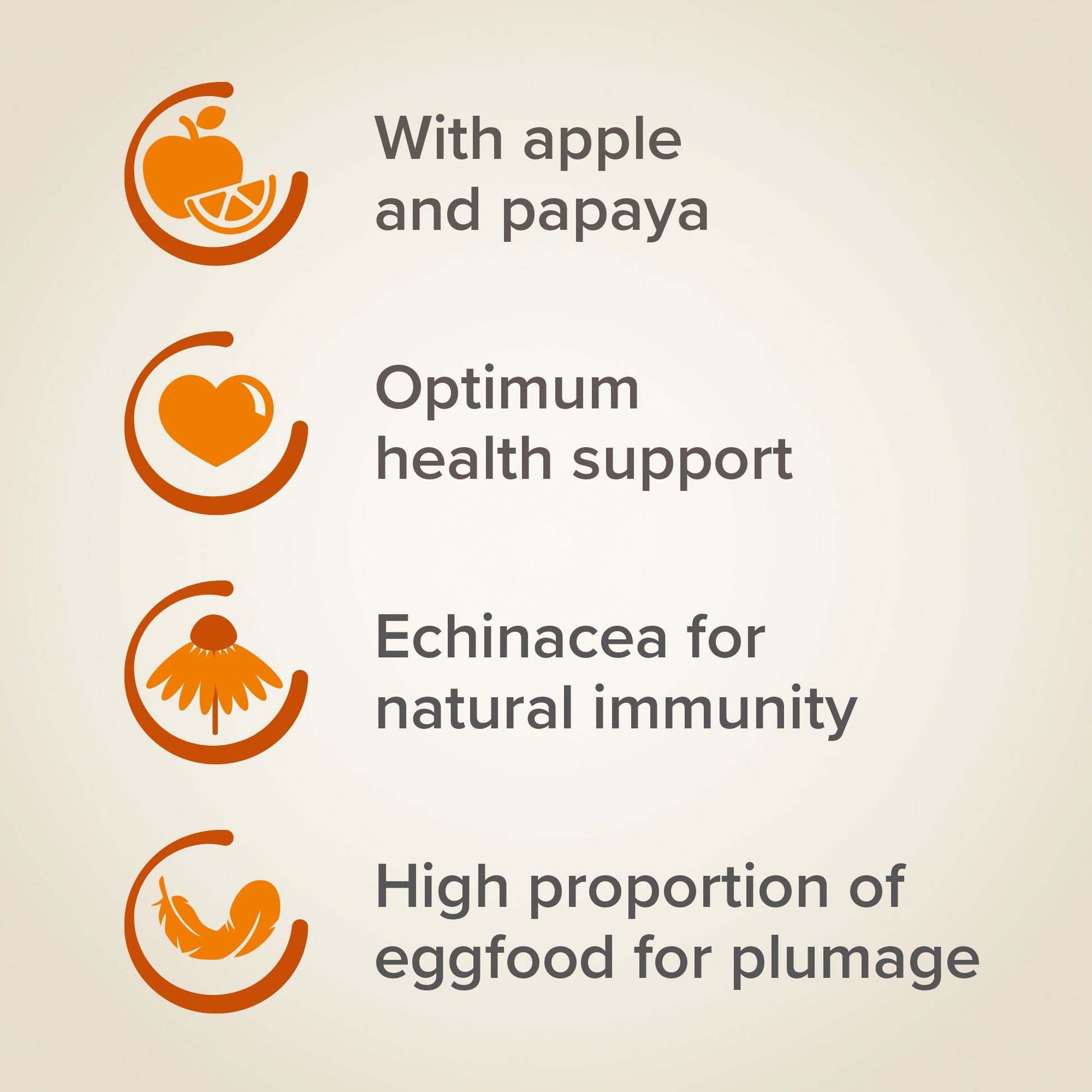 Benefits: • A COMPLETE, TASTY & BALANCED FOOD: Contains a blend of high quality seeds, egg food, and fruits, including apple and papaya • SPECIFIALLY FORMULATED FOR CANARIES: Formulated in collaboration with nutritionists, vets and bird experts • HIGH PROPORTION OF EGG FOOD FOR PLUMAGE: An essential nutritional supplement for seed-eating birds to help improve plumage; essential for breeding, growth and moulting • ECHINACEA FOR NATURAL IMMUNITY: A plant extract that supports a healthy immune system, promotes rapid recovery after illness and improves condition • OPTIMUM HEALTH SUPPORT: High protein and low fat to maintain a healthy bodyweight, with essential vitamins and minerals to prevent deficiencies and promote well-being For best results: ALWAYS FULLY READ THE PRODUCT PACKAGING BEFORE USE.
