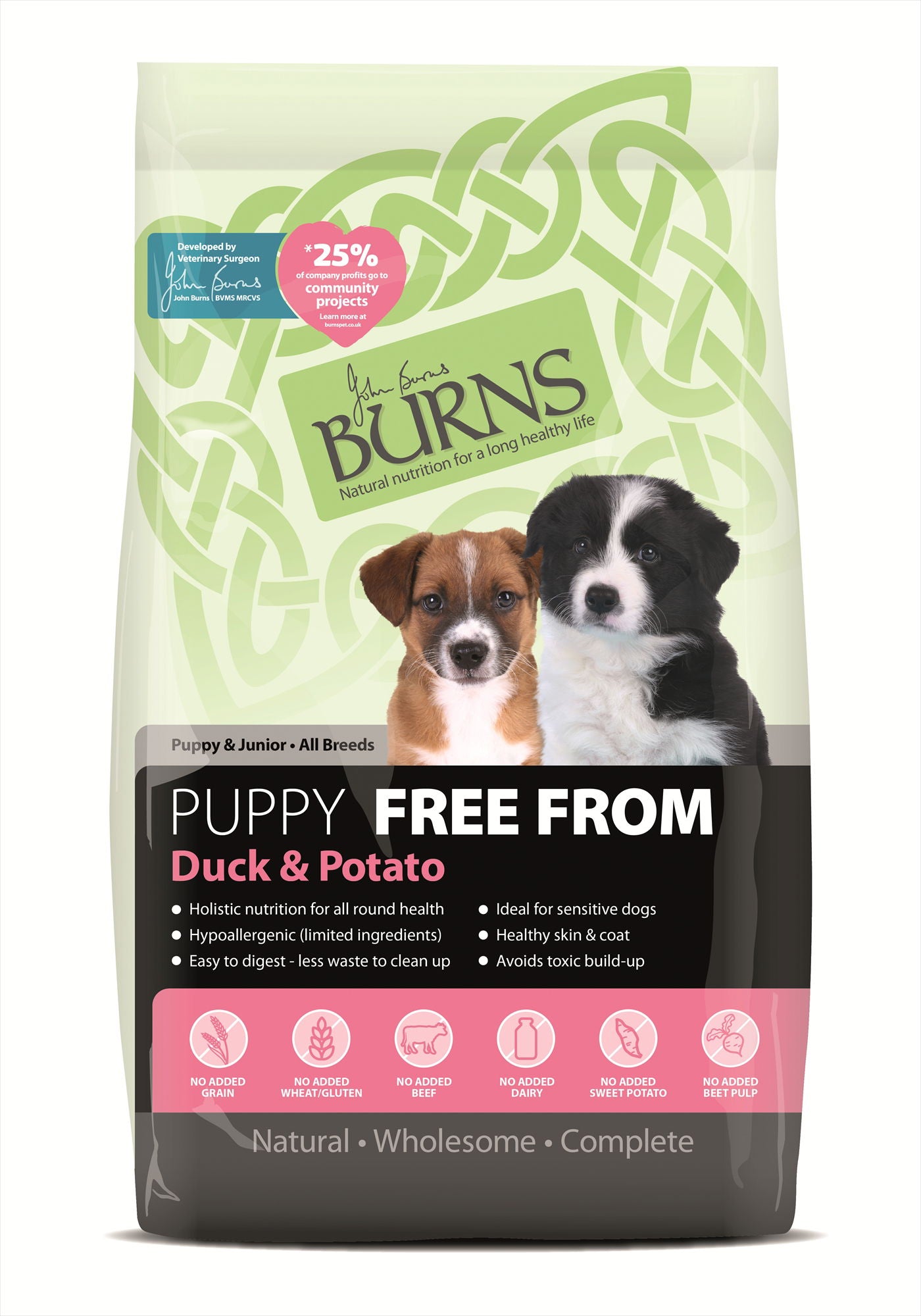 Searching for a grain-free diet for puppies? You’ve come to the right place. Made with natural ingredients, Burns Duck & Potato contains all the nutrients your puppy needs while avoiding common allergens. Give your puppy a healthy start in life with Burns. Product Benefits: •Developed by Veterinary Surgeon John Burns •Grain-free, gluten free and dairy free •Contains nutrient-rich buckwheat •Contains vitamins which support all-round health •Highly-digestible •Low daily feeding costs
