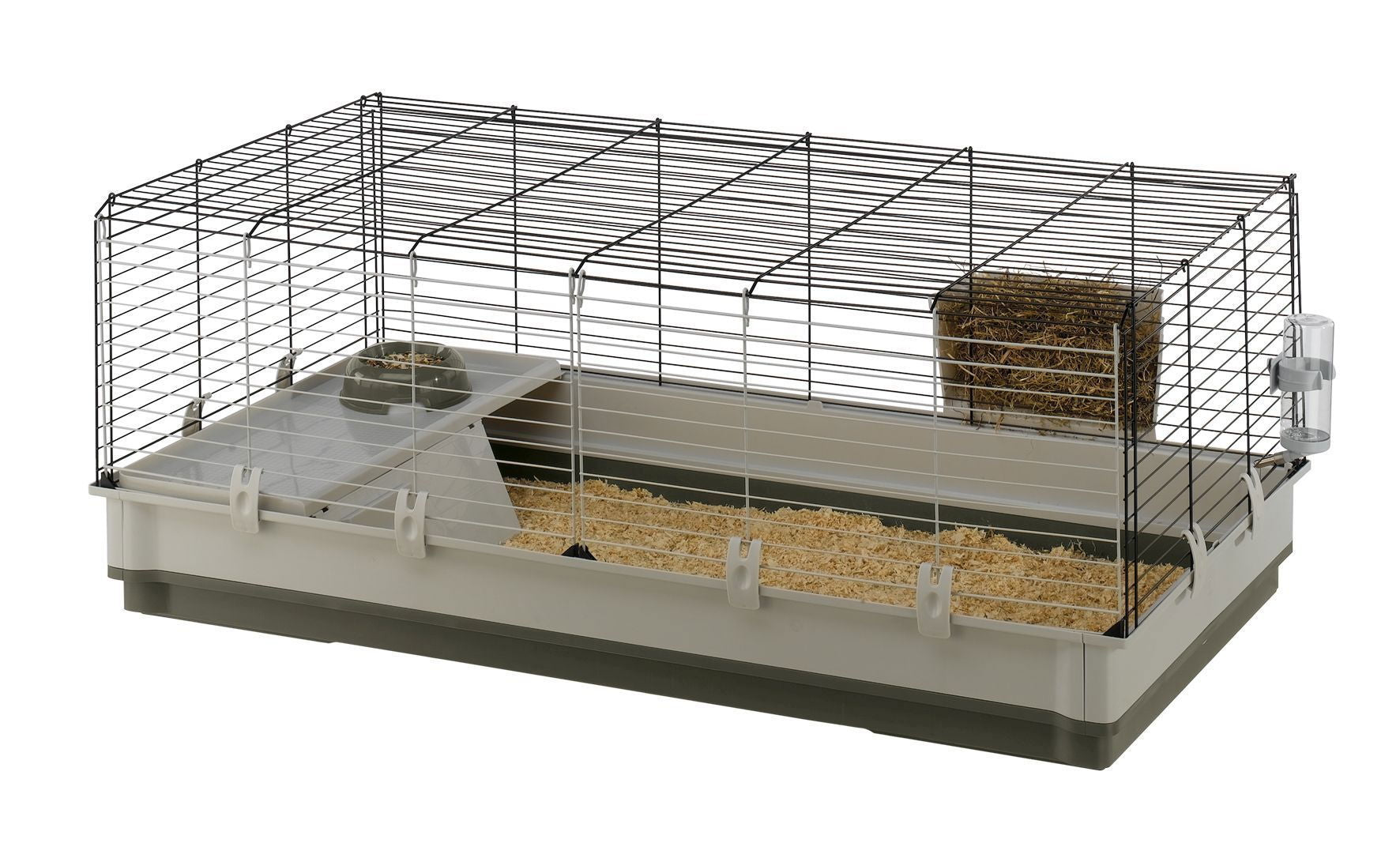 Krolik is the range of cages for rabbits and guinea pigs characterised by a completely removable system of both the net and the bottom, equipped with a front door and roof that can be completely opened. Supplied in space-saving packaging, Krolik small animal habitats minimize transport volume, while ensuring maximum living space for the animal thanks to the patented bottom design that has no flaring. They are made of painted metal mesh, equipped with a useful front door that can be opened to allow great ease of use and maintenance. For more accurate cleaning, it is also possible to quickly separate the net from the bottom. Accessories included such as a plastic house with bowl and bulkhead and steps, hay feeder and drinking bottle. Furthermore, on the side of the cage, a convenient ladder will allow the animal to go out and enter independently and move freely around the house. Krolik are eco-sustainable products: they are in fact produced with material coming from industrial recycling and post-consumption.