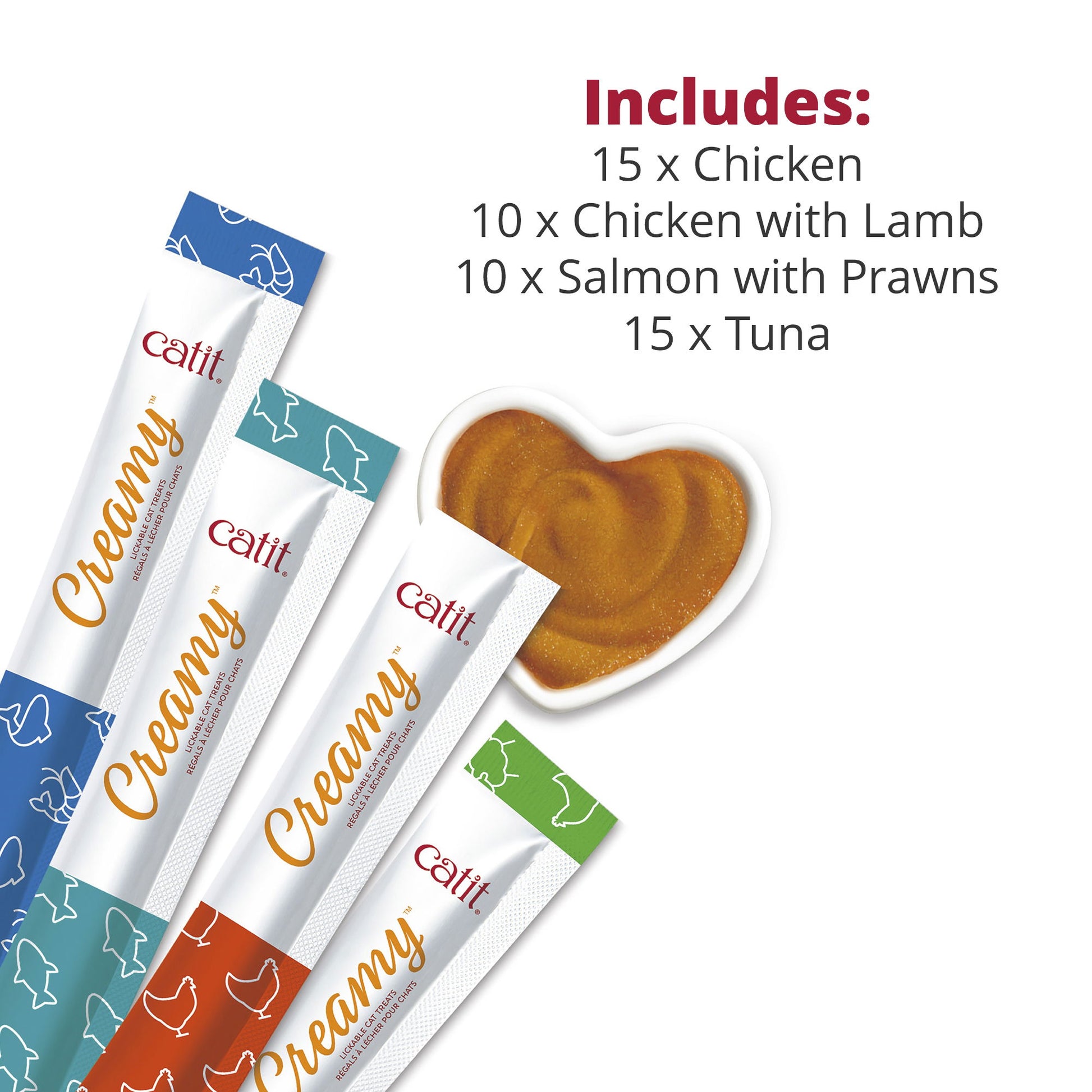 Consisting of 15 x Chicken, 10 x Chicken & Lamb, 10 x Salmon & Prawn and 15 x Tuna, this variety pack mixes all our Catit Creamy flavours together in one handy pack.