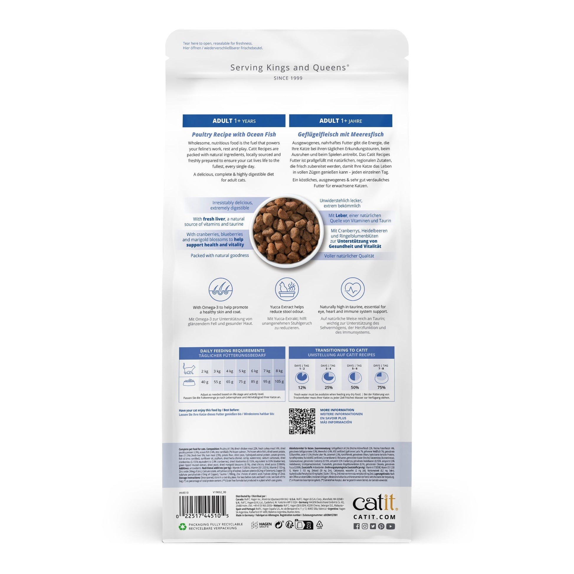 Made with real poultry, salmon and whitefish, including high-quality protein of which 80% of animal origin Irresistibly delicious, extremely digestible With Omega-3 fatty acids to help promote a healthy skin and coat With Yucca Extract to help reduce stool odours Naturally high in taurine, an essential amino acid in cats No grains, wheat, soya, artificial flavours, or colours Catit Recipes dry food is freshly prepared at a climate-neutral facility, applying the highest international standards for food quality and hygiene. Unlike most other pet foods, we use recyclable packaging made of LDPE4, which is fully recyclable at most supermarkets and recycling centres, or in your kerbside recycling bin (check with your local authority). Planet-friendly production and packaging to save the planet one pawprint at a time. Composition: Poultry (41.5%) (fresh chicken meat 22%, fresh turkey meat 14%, dried poultry protein 5.5%), ocean fish (14%, msc certified) (7% frozen salmon, 7% frozen white fish), dried sweet potato, liver (11.5%) (fresh liver 9%, liver meal 2,5%), potato flour, dried peas, hydrolyzed animal protein, potato protein, fish oil (msc certified), sunflower oil, psyllium, dried herbs (fennel, catnip, watercress), calcium carbonate, dried cranberries (0.155% equivalent to 0.9% cranberries), dried blueberries (0.155%, equivalent to 0.9% blueberries), green lipped mussel extract, dried yeast, dried marigold blossoms (0.1%), dried chicory, dried yucca (0.006%)