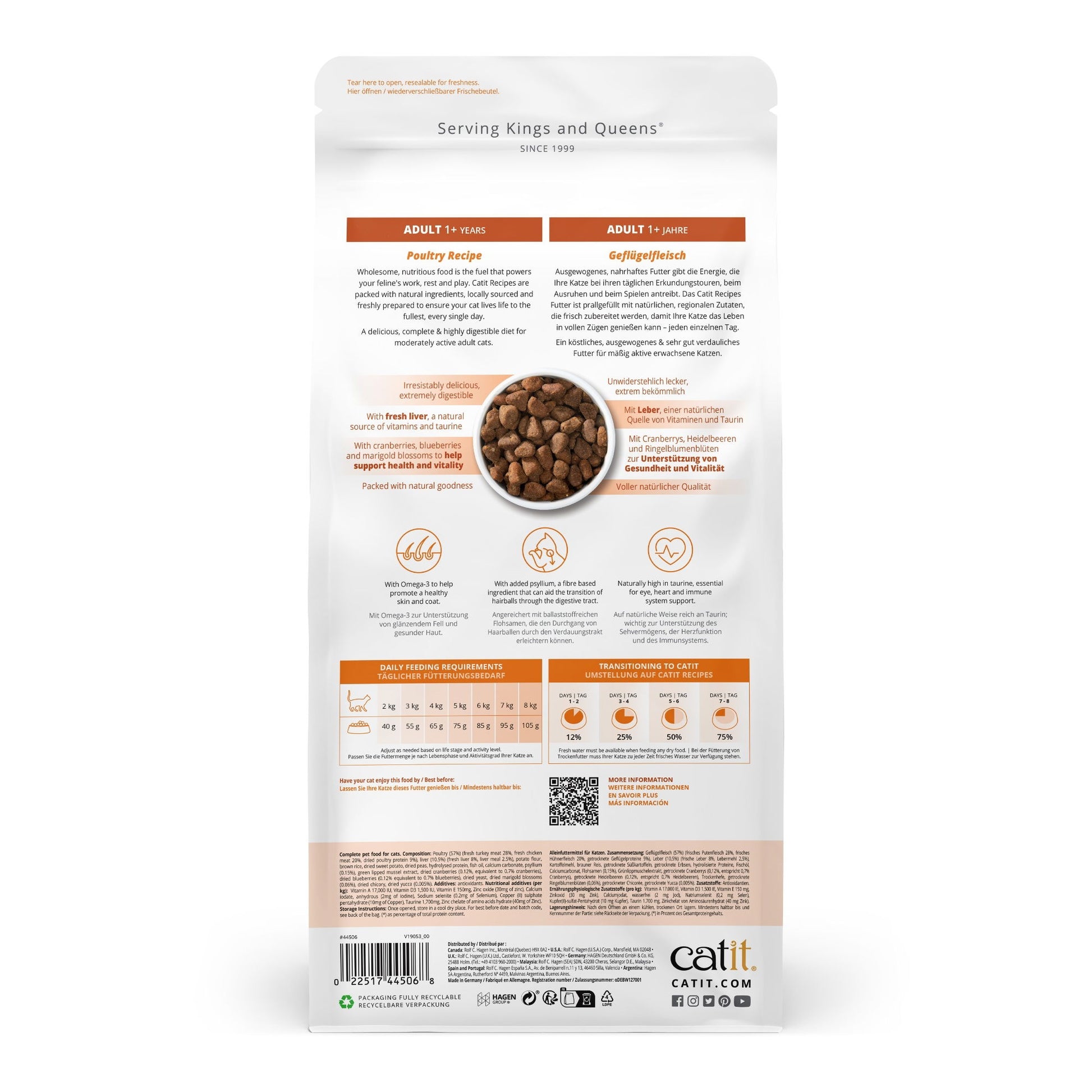 Made with real poultry, including high-quality protein of which 87% of animal origin Irresistibly delicious, extremely digestible With Omega-3 fatty acids to help promote a healthy skin and coat Added psyllium which can aid the transition of hairballs Naturally high in taurine, an essential amino acid in cats No wheat, soya, artificial flavours or colours Catit Recipes dry food is freshly prepared at a climate-neutral facility, applying the highest international standards for food quality and hygiene. Unlike most other pet foods, we use recyclable packaging made of LDPE4, which is fully recyclable at most supermarkets and recycling centres, or in your kerbside recycling bin (check with your local authority). Planet-friendly production and packaging to save the planet one pawprint at a time. Composition: Poultry (57%) (fresh turkey meat 28%, fresh chicken meat 20%, dried poultry protein 9%), liver (10.5%) (fresh liver 8%, liver meal 2.5%), potato flour, brown rice, dried sweet potato, dried peas, hydrolysed protein, fish oil, calcium carbonate, psyllium (0.15%), green lipped mussel extract, dried cranberries (0.12%, equivalent to 0.7% cranberries), dried blueberries (0.12% equivalent to 0.7% blueberries), dried yeast, dried marigold blossoms (0.06%), dried chicory, dried yucca (0.005%).