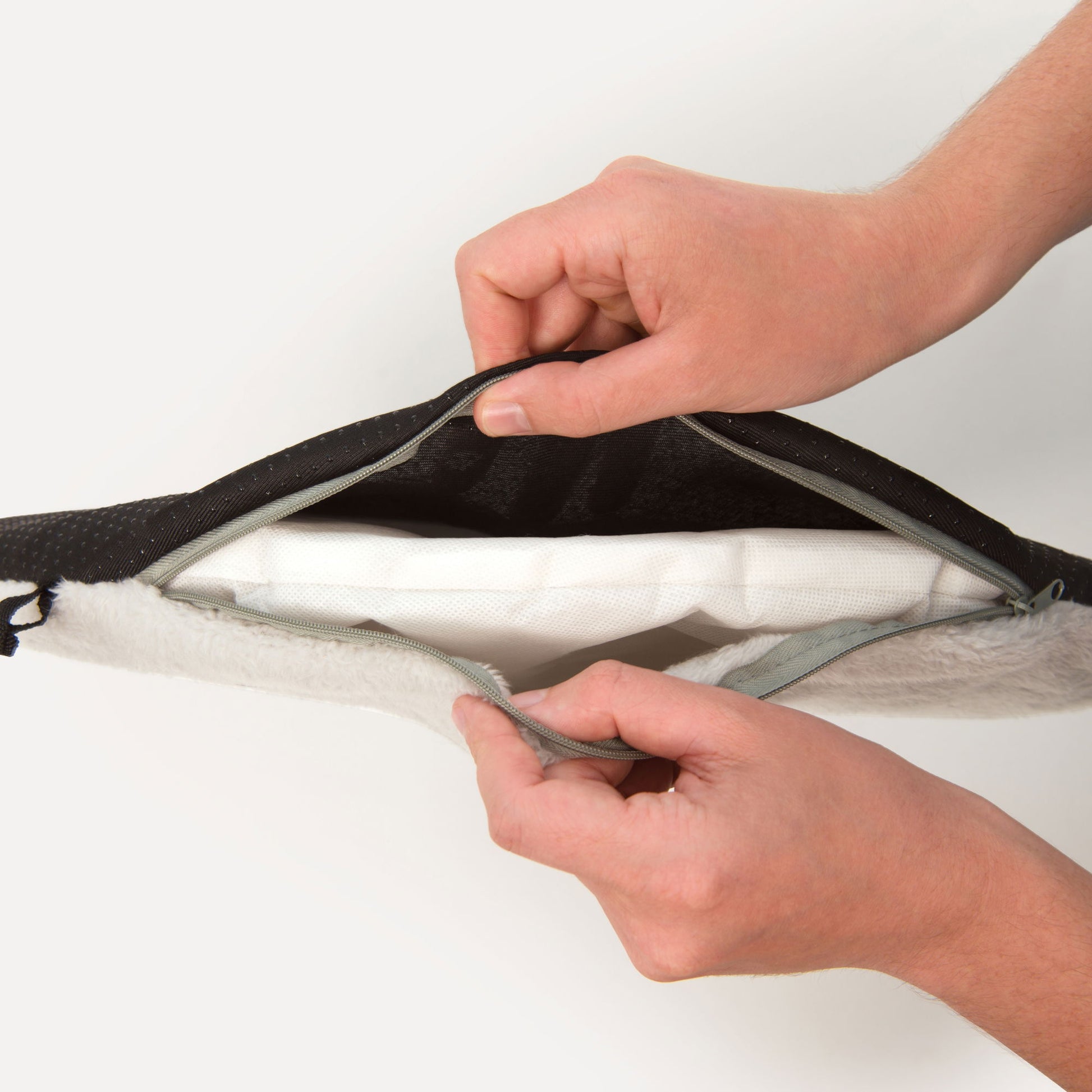 Made of high-quality fabric Open on both ends, with an opening featuring a plush ball toy on a string Easy to fold up and store Includes cushion with removable sleeve for easy cleaning