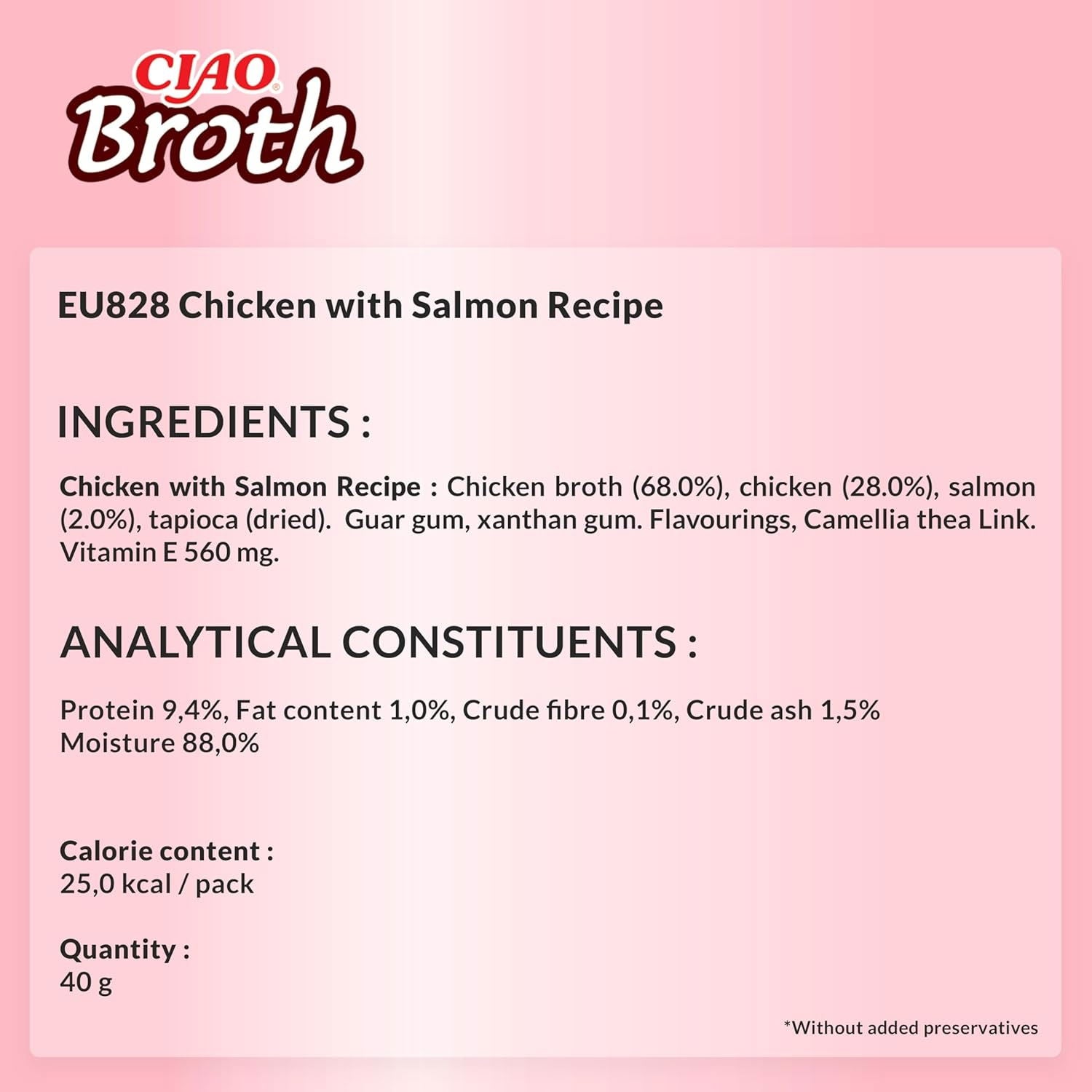 Chicken Broth (68.0%), Chicken (28.0%), Salmon (2.0%), Tapioca (Dried).