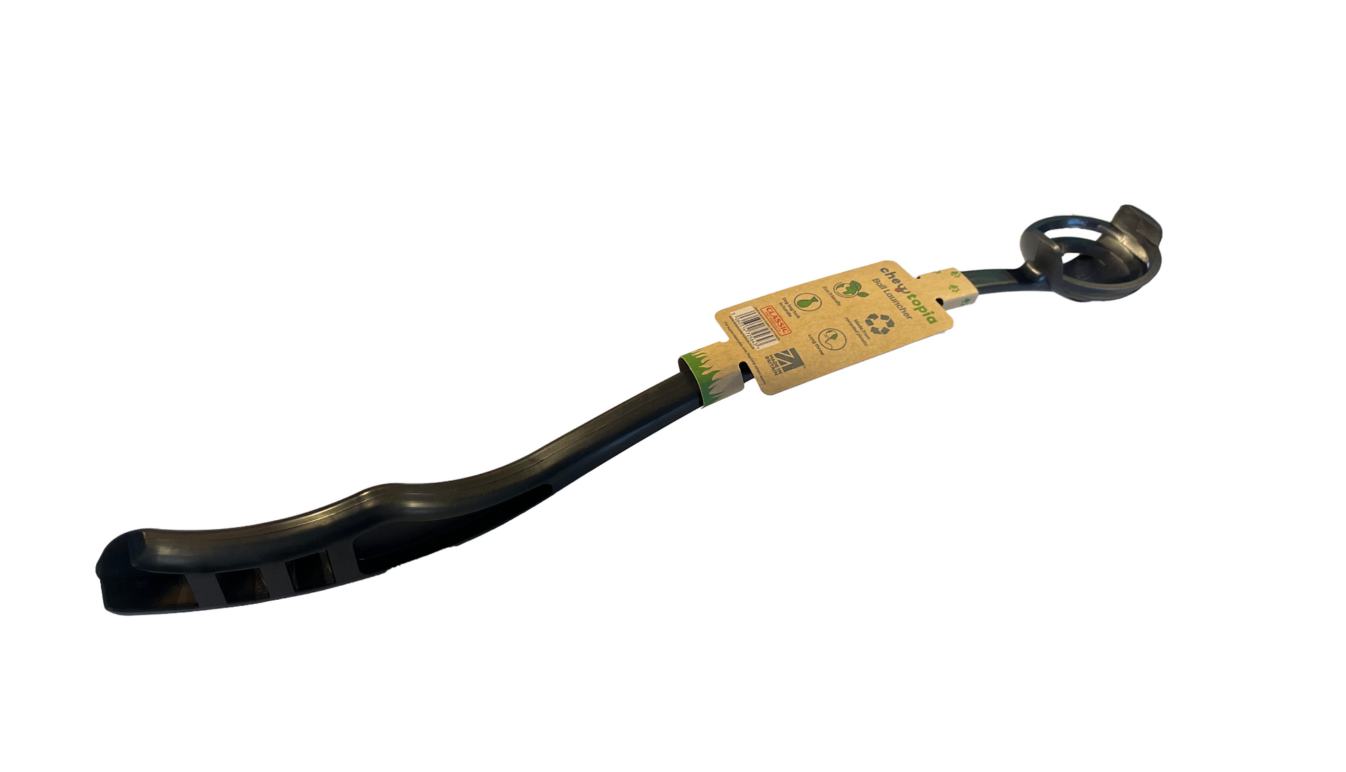 The Chewtopia Ball Launcher, manufactured from recycled plastic, is a super-quality interactive dog throw toy. Designed to fit the Chewtopia Fetch Ball Fits standard sized tennis balls Lightweight ergonomic design Subtle flex for easier ball throwing and pick up Poo Bag Porter can attach to handle / Tuck space for poo bag storage in the handle base Great for interactive dog and owner play Can be used as an aid for obedience and command training