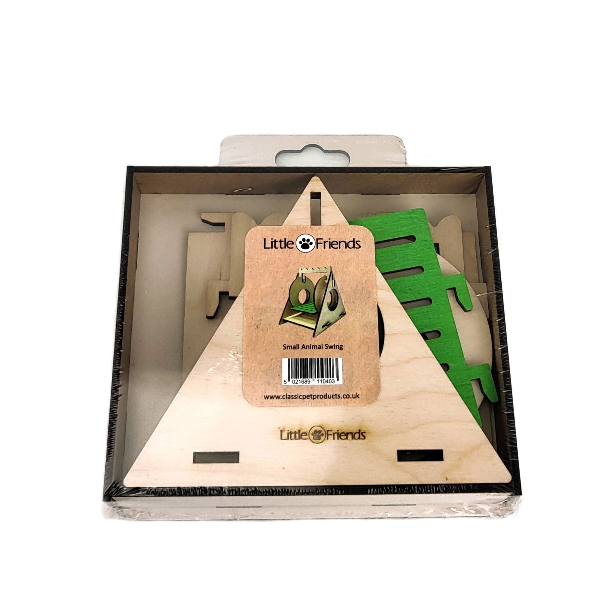 Innovative fun flat pack small animal swing toy Neat Secure Interlocking Sections Durable Gnaw Resistant Excellent Manufacture Quality Non-Toxic. Made from Plywood Measurements: 14 x 10 x 2cm