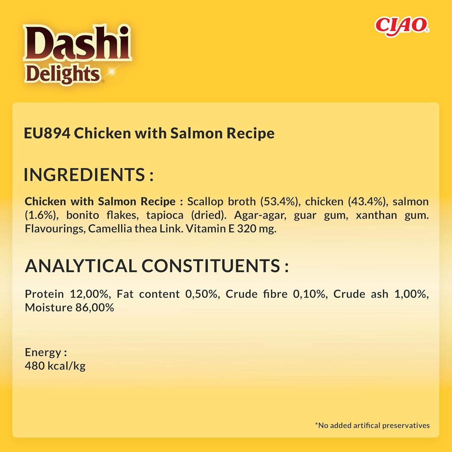 What is Dashi? Dashi is a traditional Japanese fish-based broth made from bonito flakes, known for its rich, savory flavor. Dashi is low in calories and fat, making it a healthy addition to your cat's diet. Silky Broth made from dried wild-caught tuna (bonito flakes), mixed with shreds of chicken for added proteins. Hydrating & Delicious Cat Complements: Complement your fur babies meal with a hydrating cat side dish with up to 93% moisture Simply Delightful: Fresh ingredients with added Vitamin E to support their immune system and Green Tea Extract as a natural antioxidant. Delight your cat with these single-serve side dish Add Some Variety To Your Cats Life: Available in six recipes that cats of all breeds and stages (kitten to senior) will enjoy as a boost to their bowl Grain-free, preservative-free & free from artificial colours