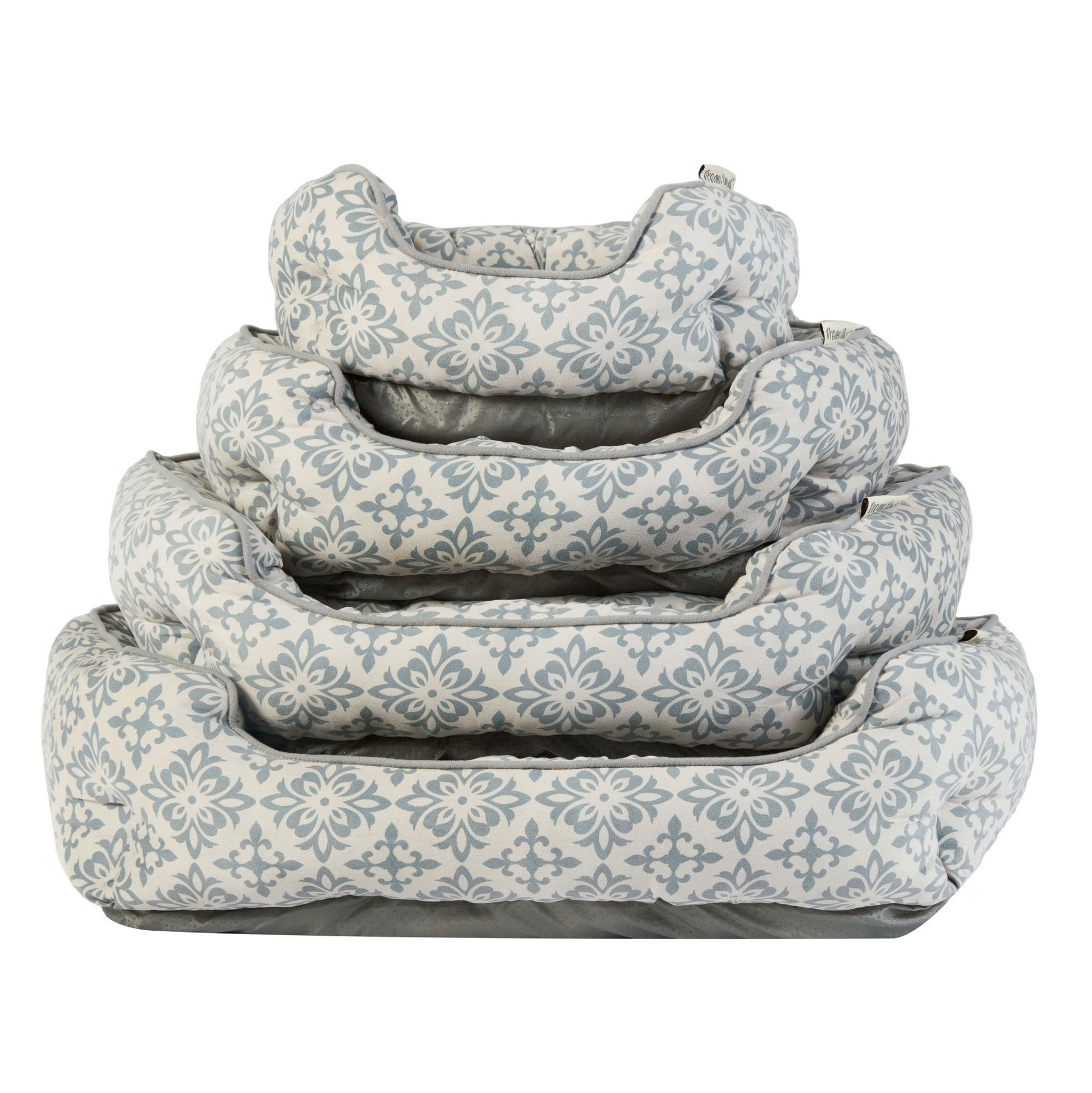 A luxurious choice for any spoiled pet, this stylish patterned bed is the perfect addition to your furry friend's nighttime routine. The faux suede bed comes with a deeply filled base and high scalloped sides, and the indulgently soft plush cotton filling provides your pet the best support for their neck and back. The neutral colour is perfect to suit any home, while the grey floral pattern brings a little touch of fun whether kept in the bedroom, kitchen, or lounge. This pet bed is fully machine washable at 30 degrees and has a non-slip base to help keep it firmly in place on hard floors. Ideal for your pet to relax in comfort and style. An ideal size for extra large dog breeds.