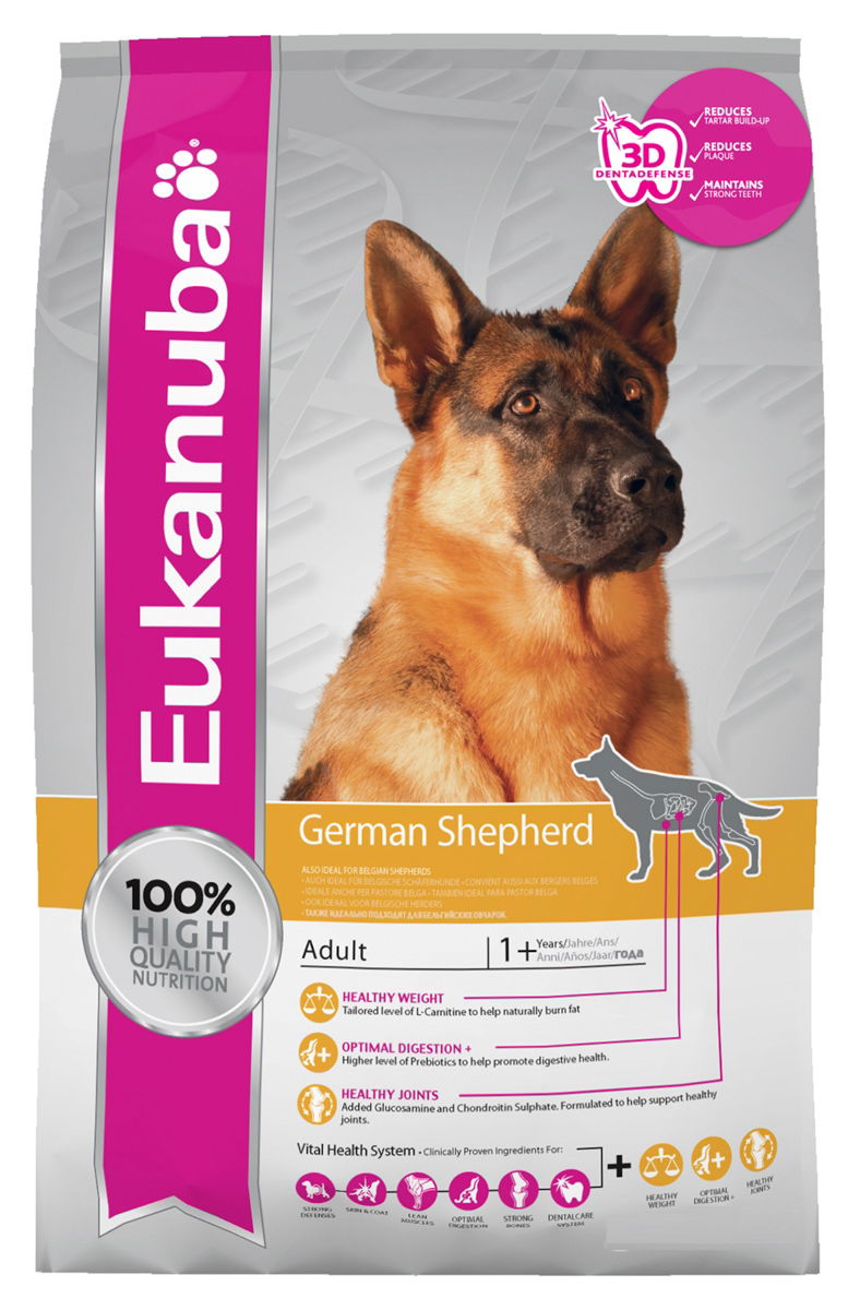 German Shepherds are lively, aware large breed dogs eager to please their owner. Unfortunately, they can be prone to sensitive digestion and impaired mobility. Eukanuba German Shepherd is a complete and balanced daily food designed to promote healthy digestion, firm stools and mobility. Eukanuba German Shepherd formula is made with: 1. A blend of special dietary fibres to promote healthy digestion and nutrient absorption 2. Glucosamine + chondroitin sulphate for healthy joints and mobility 3. L-carnitine to help naturally burn fat instead of storing it 4. Omega-6 and 3 fatty acids, zinc + copper for optimal skin and coat care Also suitable for Belgian Shepherds, which share the same nutritional needs