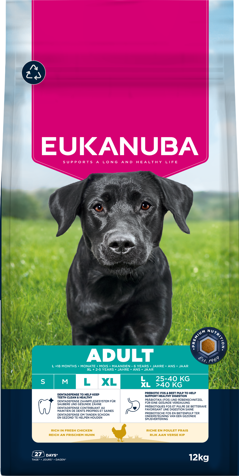 EukanubaANUBA Life Care offers science-backed premium nutrition, designed to meet the changing needs of dogs through every stage of life. This dry food, packed with fresh chicken, is expertly crafted to meet the nutritional needs of large-sized adult dogs aged from 18 months to 6 years (or 2 to 5 years for giant breeds). This premium formula includes L-Carnitine, which helps metabolise fat, helping your dog maintain an optimal weight and reducing strain on their joints for better mobility and comfort. The food also contains glucosamine and calcium to help maintain healthy joints and strong bones. A tailored fibre blend, featuring prebiotic FOS and beet pulp, promotes healthy digestion, ensuring your dog gets the most out of their meals. Natural sources of omega-6 and omega-3 fatty acids further contribute to healthy skin and a shiny coat, while antioxidants like vitamin E help support a strong immune system. Our unique hexagonal kibbles, combined with the DentaDefense dental care system, actively work to maintain clean, healthy teeth and reduce tartar buildup over time. This 100% complete and balanced diet provides advanced nutrition for large-sized adult dogs, supporting optimal body condition, lifelong health, and overall wellbeing. Trust EukanubaANUBA to deliver high-quality nutrition tailored to every stage of your dog’s life.