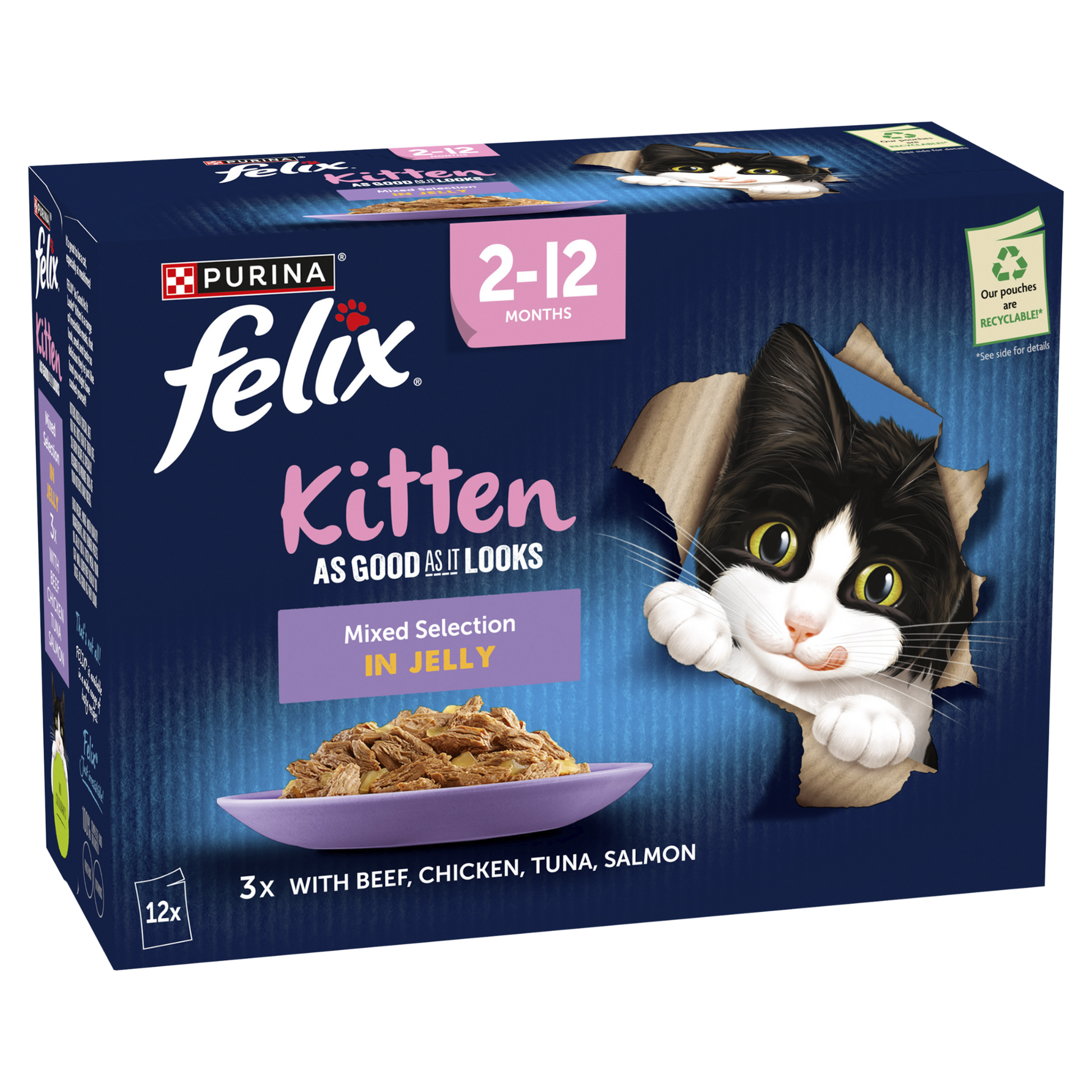 Felix Kitten is a complete meal, this means it does not need mixing with any other food. You simply pour it out of the pouch and that’s it. Just follow the feeding guide below with any irresistible flavour of your choice.