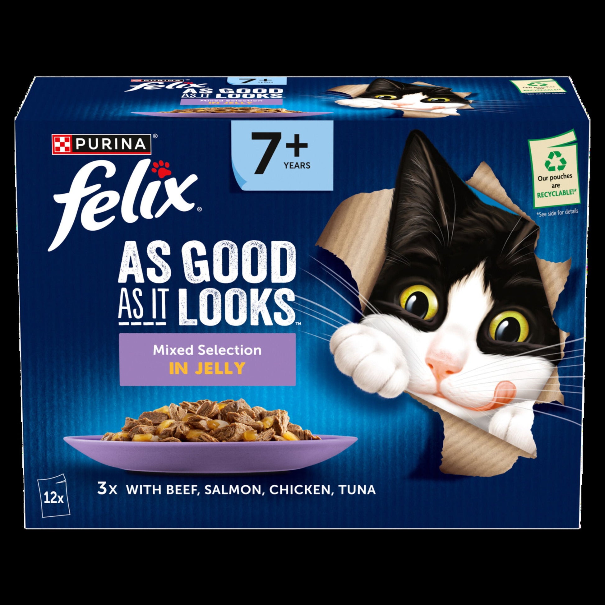 1.Tender pieces in a succulent jelly 2. Designed for Cats aged 7+ 3. 100% complete and balanced 4. Vitamins A&E & a source of omega-6 fatty acids. No colourants 5. Our pouches are now recylable in store