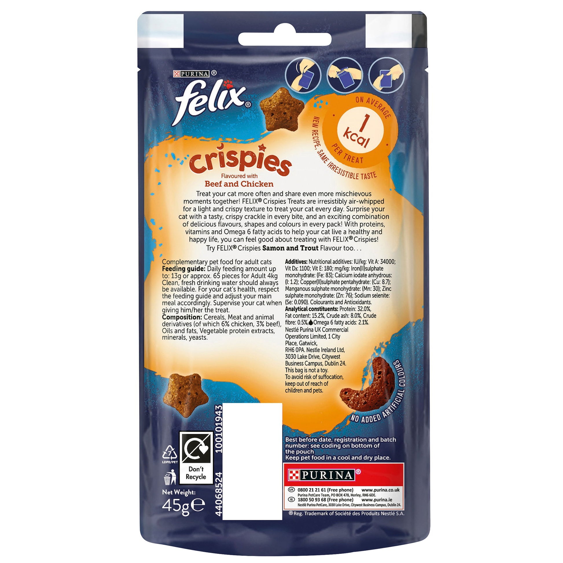Felix Crispies Cat Treats With Beef And Chicken Are Irresistibe Cat Treats.Air-Whipped To Have A Unique Light And Crispy Texture With A Tasty, Crispy Crackle In Every Bite - An Exciting Combination Of Delicious Flavours, Shapes And Colours To Treat Your Cat Everyday.