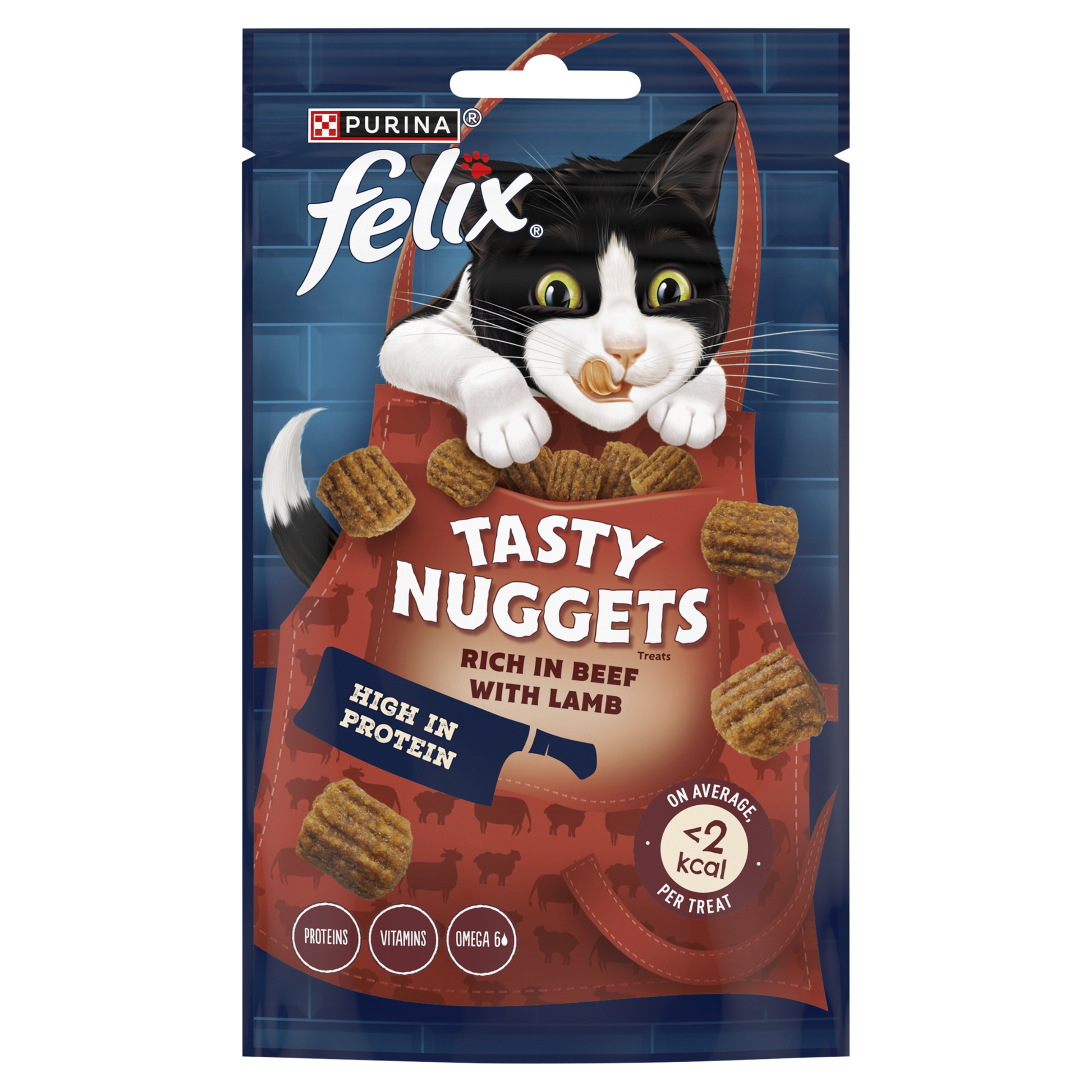 FELIX Tasty Nuggets are delightful high protein treats made with a delicious pairing of flavours to give your cat a tasty moment and an excitibly different texture. This dual flavour recipe rich in beef with lamb is less than 2kcal per treat on average and without colourants. Surprise your cat with these delicious high in protein treats with vitamins to keep your cat ready for more fun. FELIX Tasty Nuggets, the delicious high in protein treats for a moment in between meals full of flavour. COMPOSTION: Meat and animal derivatives (50% of which 22% beef, 4% lamb), cereals, oils and fats, vegetable protein extracts, Minerals, Yeasts. ANALYTICAL CONSTITUENTS: Protein 42.0%, Fat content 16.0%, Crude ash 9.0%, Crude fibre 0.5%, omega 6 fatty acids 2.0%. FEEDING GUIDE: Daily feeding amount up to: Adult 4kg 13g or approx. 30 pieces. Clean, fresh drinking water should always be available. For your cat's health, respect the feeding guide, adjust your main meal accordingly, and exercise him daily. Supervise your cat when giving him/her the treat.