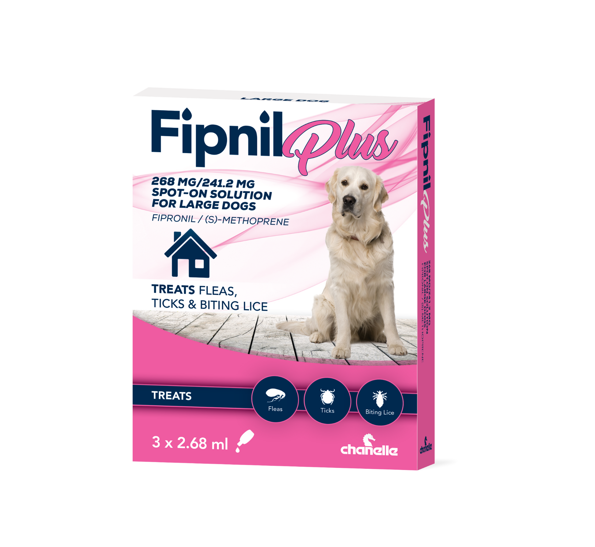 Spot-On Solution for Large Dogs, Vet Strength Formulation, Treats Fleas, Ticks and Biting Lice, Protects the home, Easy to apply, Can be used on Puppies over 2kg and 8 weeks old, Protects for up to 4 weeks after application. Contains Fipronil (s)-Methoprene