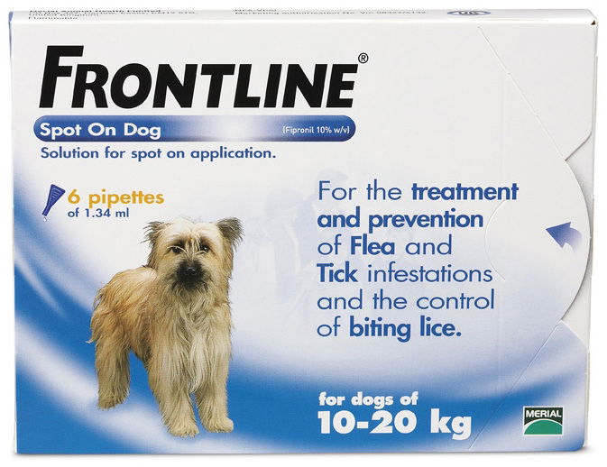 Spot On Solution Containing 10% W/V Fipronil. Presented In Plastic Pipettes, Each Containing 0.67 Ml (67 Mg Fipronil). The Treatment And Prevention Of Infestations By Fleas (Ctenocephalides Spp.) And Ticks (Rhipicephalus Spp., Dermacentor Spp.And Ixodes Spp.) And As Part Of A Treatment Strategy For Flea Allergy Dermatitis, Where This Has Been Previously Diagnosed By A Veterinary Surgeon. The Product Controls Infestations Of Biting Lice (Trichodectes Canis) On Dogs. Frontline Spot On Dog Can Be Used In Puppies From 8 Weeks Of Age And Weighing Over 2Kg.