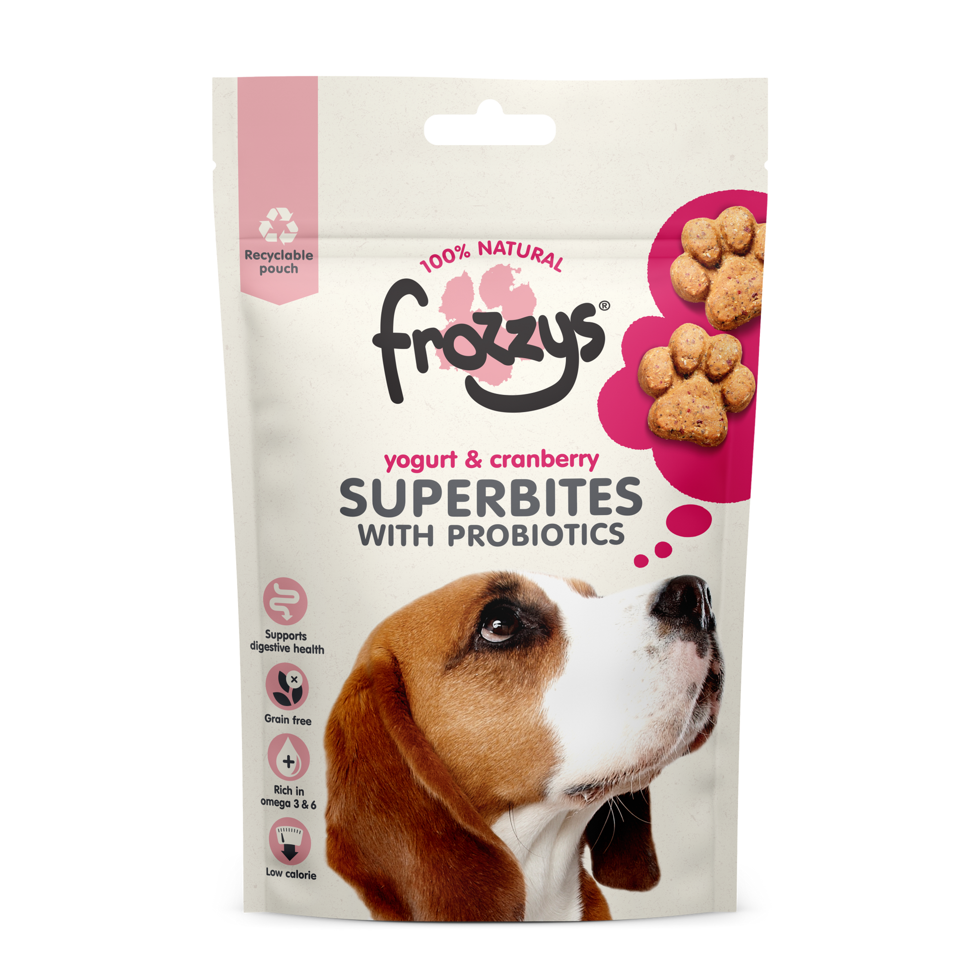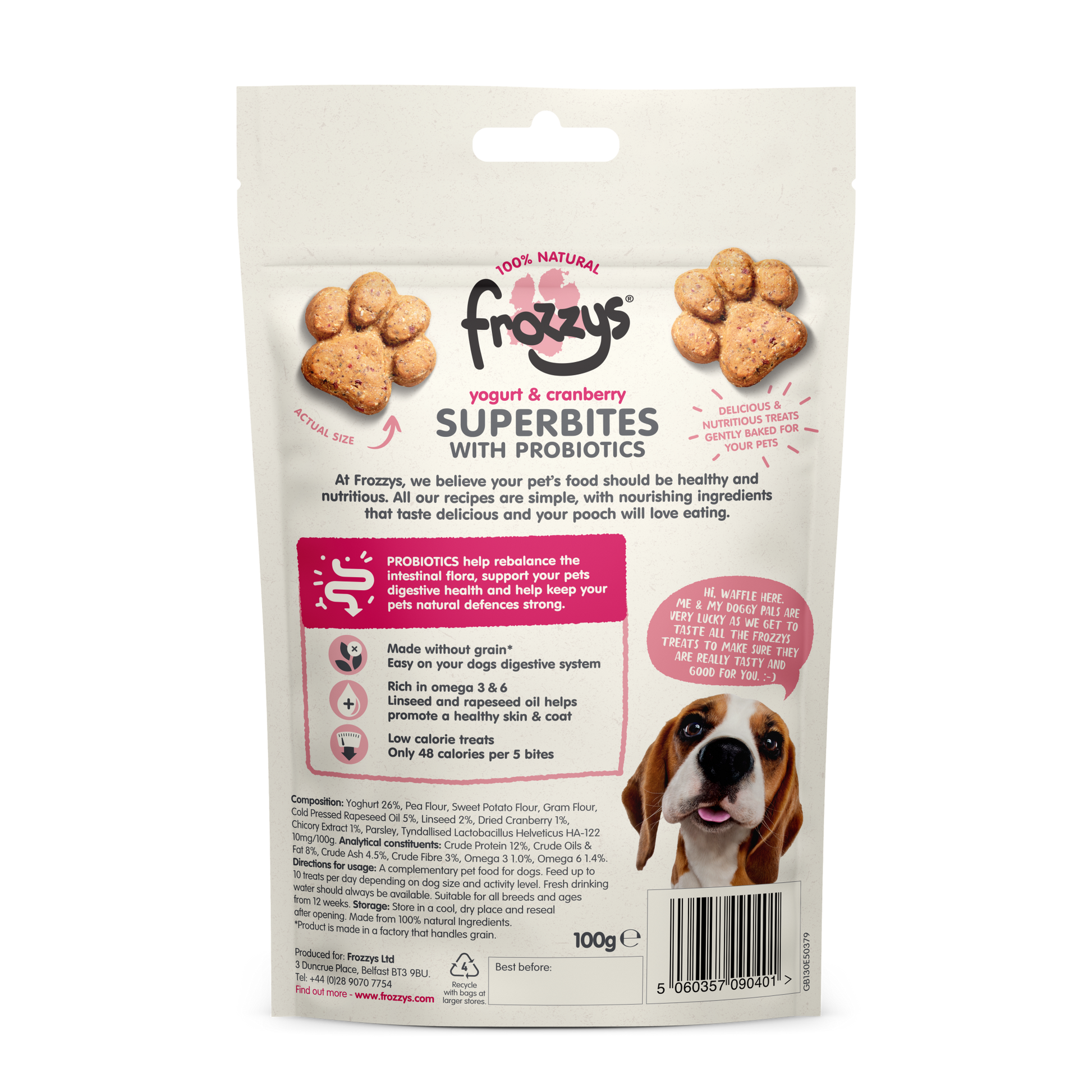 Superbites with Probiotics, Yogurt & CranberryRich in Omega 3 and 6, Low in calories, Grain free, Supports digestive healthA complementary pet food for dogs. Feed up to 10 treats per day depending on dog size and activity level. Fresh drinking water should always be available. Suitable for all breeds and ages from 12 weeks.Yogurt 26%, Pea Flour, Sweet Potato Flour, Gram Flour, Cold Pressed Rapeseed Oil 5%, Linseed 2%, Dried Cranberry 1%, Chicory Extract 1%, Parsley, Tyndallised Lactobacillus Helveticus HA-122 10mg/100g.Crude Protein 11.5%, Crude Oils & Fat 8%, Crude Ash 4.5%, Crude Fibre 3%, Omega 3 1%, Omega 6 1.4%Recyclable Pouch