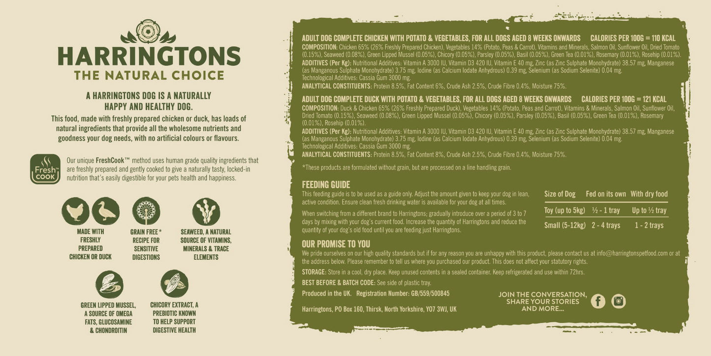 These tasty and nutritious recipes are packed full of freshly prepared meat ingredients, vegetables, botanicals, vitamins and minerals. Cooked gently using their FreshCook method - Harringtons take freshly prepared human grade ingredients and cook them gently for naturally tasty, locked-in nutrition that's easy to digest for your pet's health and happiness. Suitable for all dogs aged 8+ weeks.