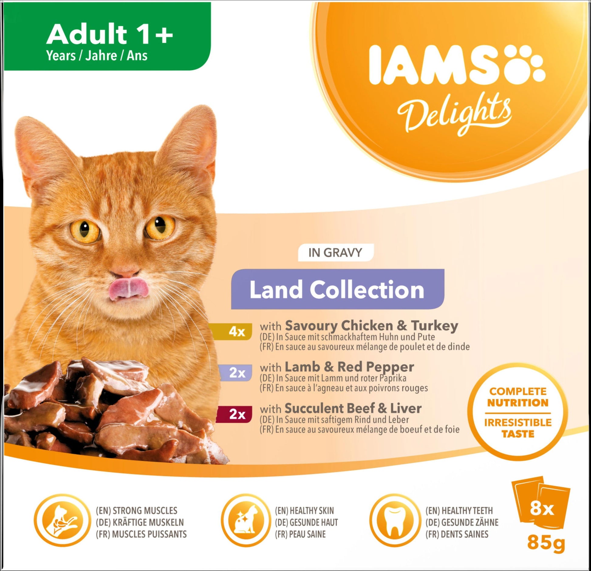 IAMS Delights Land Collection in Gravy for adult cats is a 100% complete and balanced premium wet food with an irresistible taste in a convenient pack that contains three delicious meat flavours.
