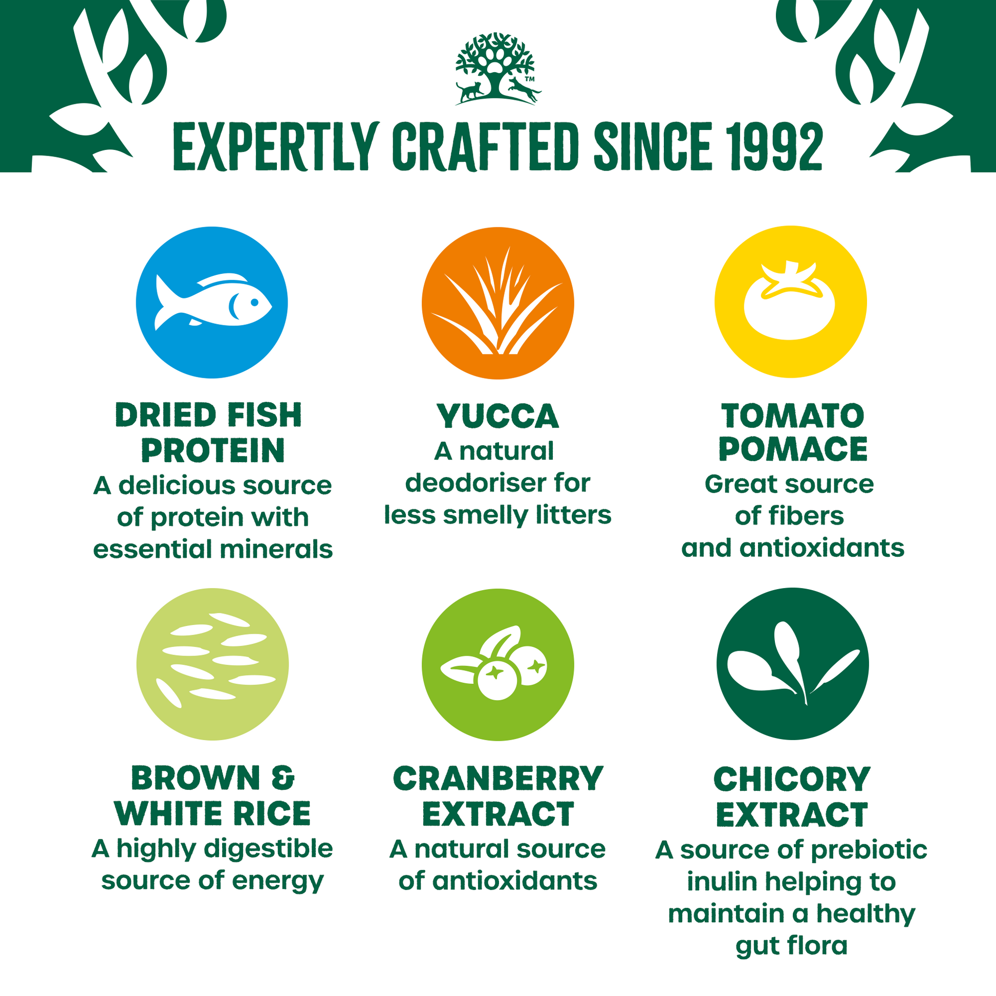Composition: dried fish protein* (28%), brown rice* (20%), white rice* (14.9%), poultry fat, maize gluten, potato protein, fish oil, fish stock, tomato pomace (2.5%), dried meat-free stock, minerals, chicory pulp, chicory extract (0.25%), dried carrots* (0.1%), cranberry extract* (0.05%), yucca extract* (0.02%). *Natural ingredient.