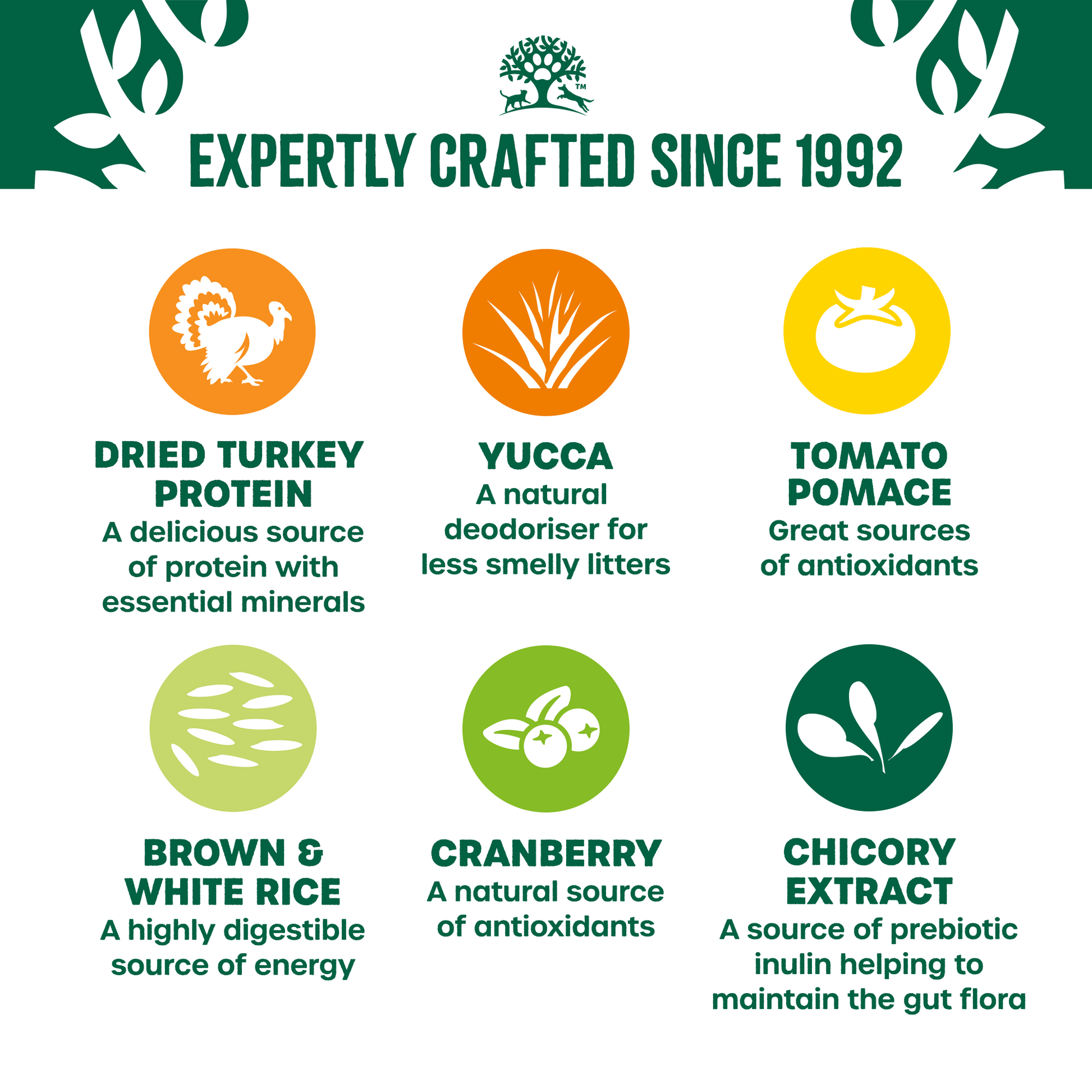 Composition: dried turkey protein* (26%), white rice* (21%), poultry fat, brown rice (8.9%), pea protein, potato protein, maize gluten, turkey gravy, tomato pomace* (2.4%), dried meat-free stock, pea starch, minerals, fish oil, chicory extract* (0.25%), dried carrots* (0.1%), cranberry extract* (0.05%), yucca extract* (0.02%). *Natural ingredient.