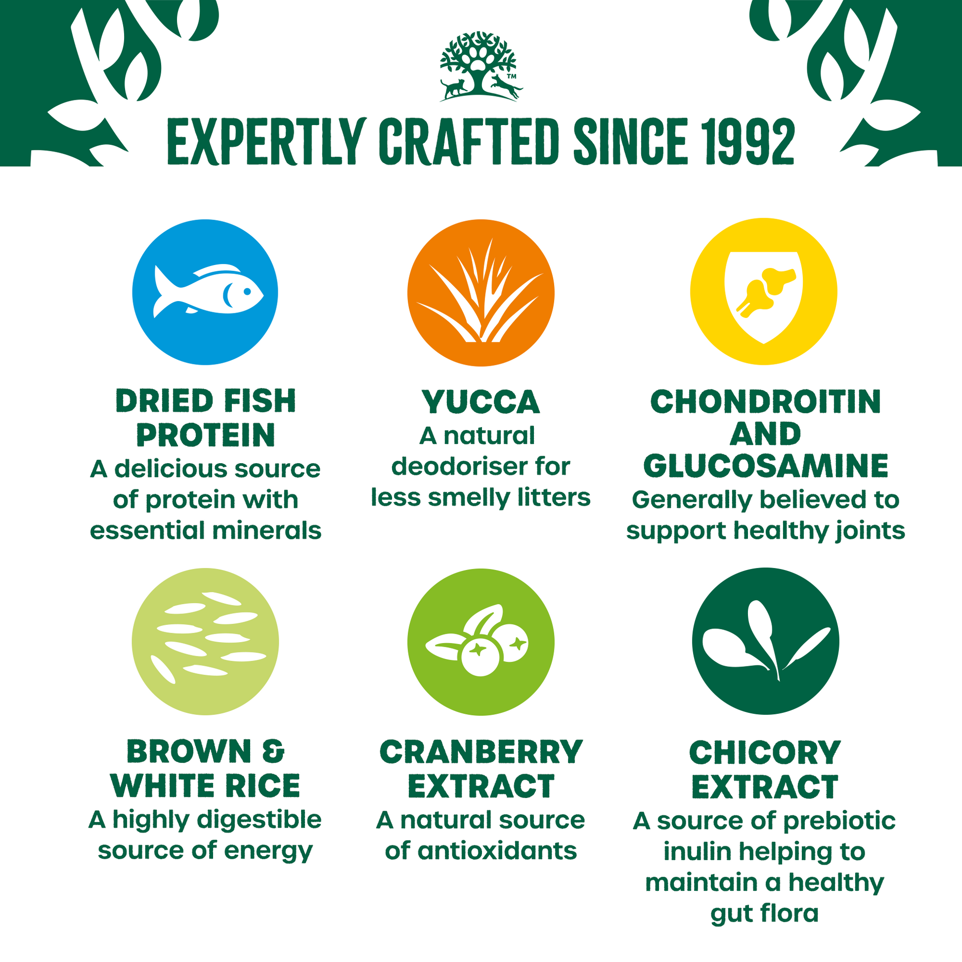 Composition: dried fish protein* (28%), brown rice* (24.5%), white rice* (11%), maize gluten, potato protein, fish stock, poultry fat, tomato pomace (3%), sugar beet pulp, alfalfa meal, fish oil, whole linseed* (1.5%), dried meat-free stock, pea protein, minerals, seaweed* (0.5%), chicory extract* (0.25%), dried carrots* (0.1%), cranberry extract* (0.05%), glucosamine (0.045%), nettles, yucca extract (0.02%), chondroitin (0.005%). *Natural ingredient.