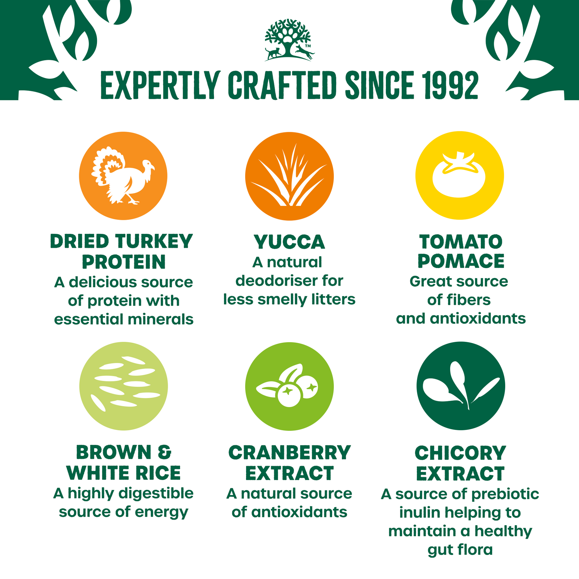 Composition: dried turkey protein* (20%), brown rice* (19.1%), white rice* (19%), poultry fat, maize gluten, pea protein, potato protein, turkey gravy, tomato pomace (2.5%), dried meat-free stock, minerals, chicory pulp, fish oil, chicory extract (0.25%), dried carrots* (0.1%), cranberry extract* (0.05%), glucosamine (0.045%), nettles, yucca extract (0.02%), chondroitin (0.005%). *Natural ingredient.