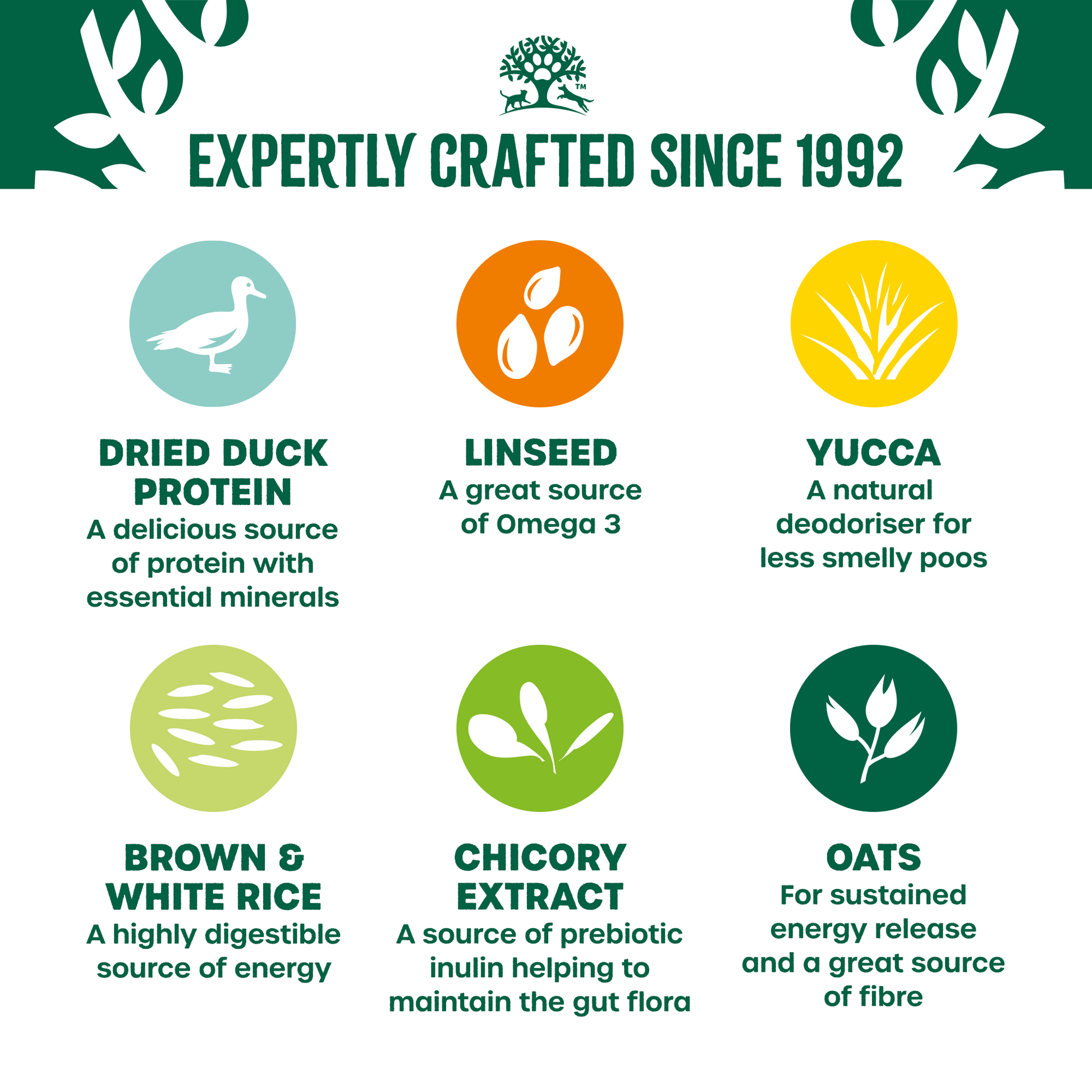 Composition: dried duck protein* (24%), naked oats, brown rice (13%), white rice* (13%), barley, whole linseed (4%), pea starch, poultry fat, duck gravy, alfalfa meal, pea fibre, chicory pulp, minerals, seaweed* (0.5%), fish oil, chicory extract* (0.1%), yucca extract* (0.02%). *Natural ingredient.