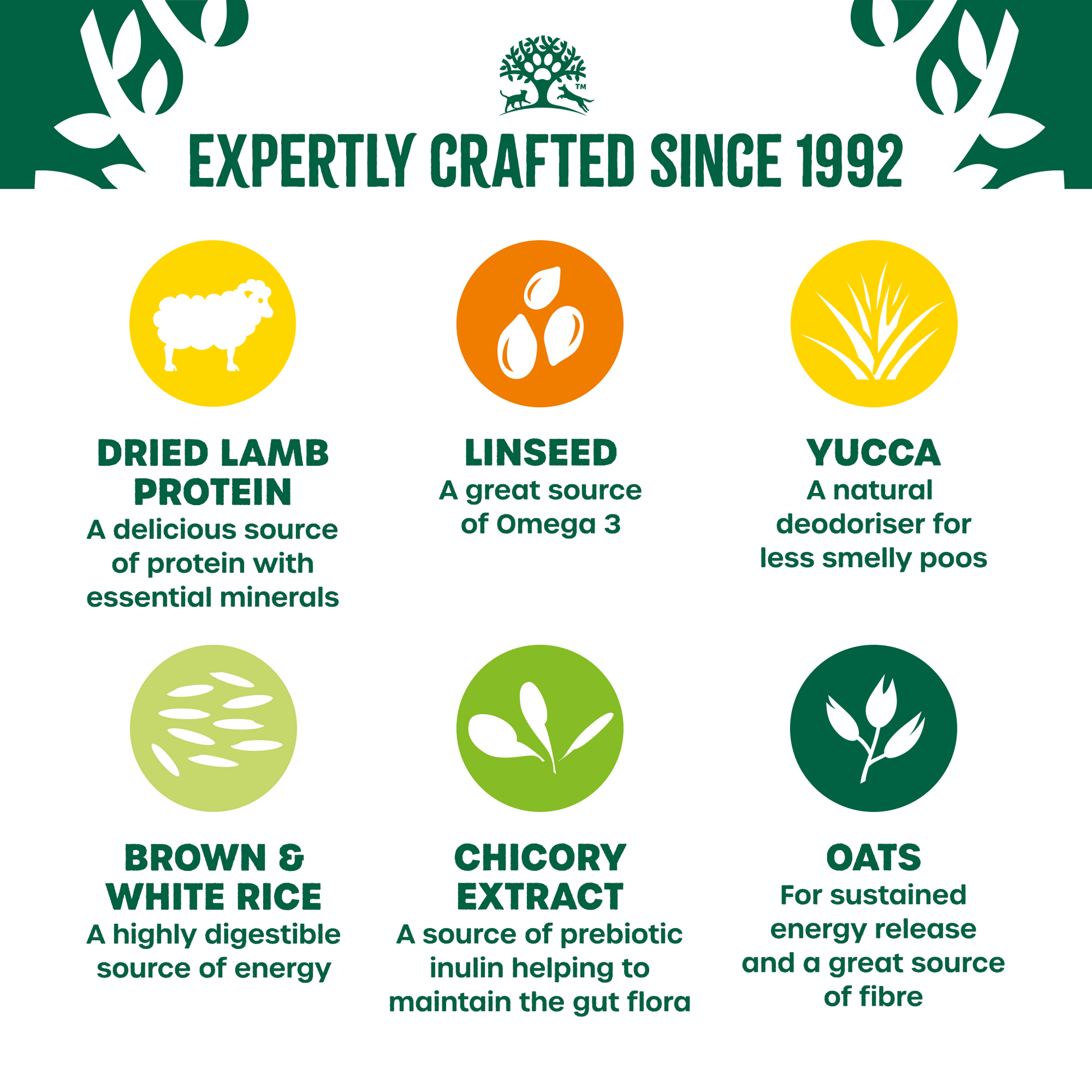Composition: dried lamb protein* (19%), barley, naked oats, brown rice* (13%), white rice* (13%), poultry fat, whole linseed (3.9%), pea protein, lamb gravy, sugar beet pulp, alfalfa meal, minerals, seaweed* (0.5%), fish oil, chicory extract* (0.1%), yucca extract* (0.02%). *Natural ingredient.