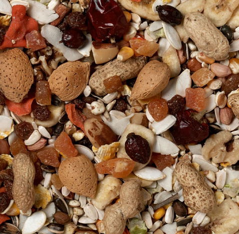 Splendid Food For Larger Parrots, Contains 25 Different Ingredients, Is 57% Fruit And Nut And Includes Rose Hips, Soft Shell Almonds, Apricots, Coconut, Brazil Nuts, Walnuts, Dates. Plenty Of Taste Andvariety, And With Food Pieces The Right Size For These Birds. Class. And Very Low In Both White And Dark (Only 5%) Sunflower