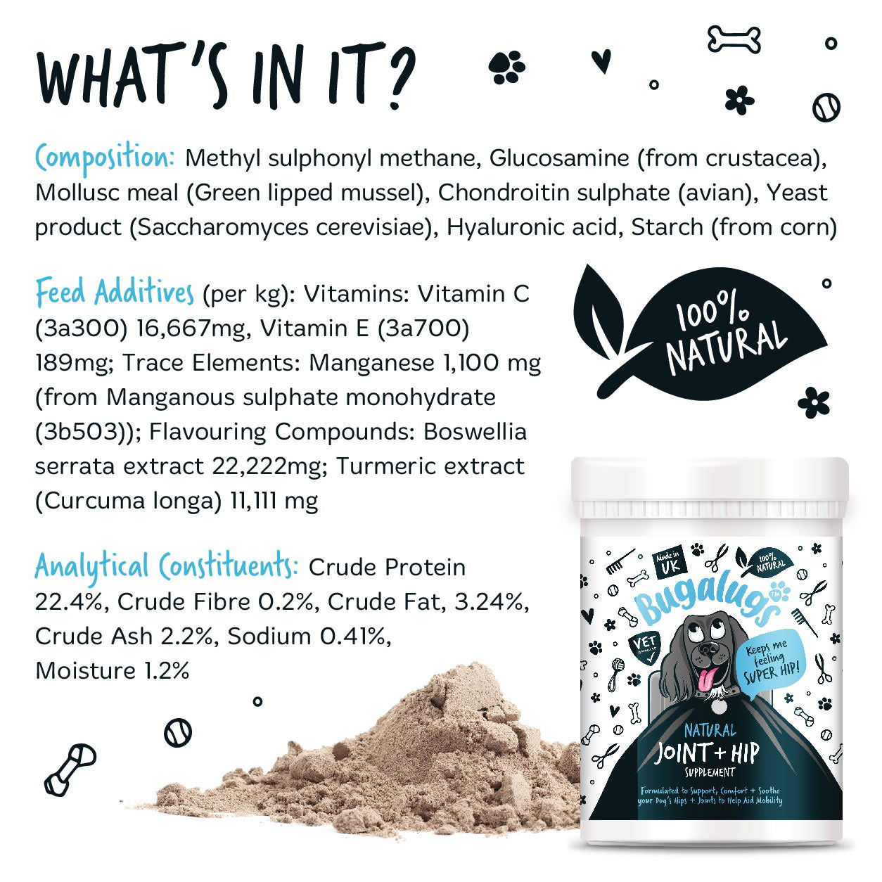A complementary Feed for Dogs Composition: Methyl sulphonyl methane, Glucosamine (from crustacea), Mollusc meal (Green lipped mussel), Chondroitin sulphate (avian), Yeast product (Saccharomyces cerevisiae), Hyaluronic acid, Starch (from corn)