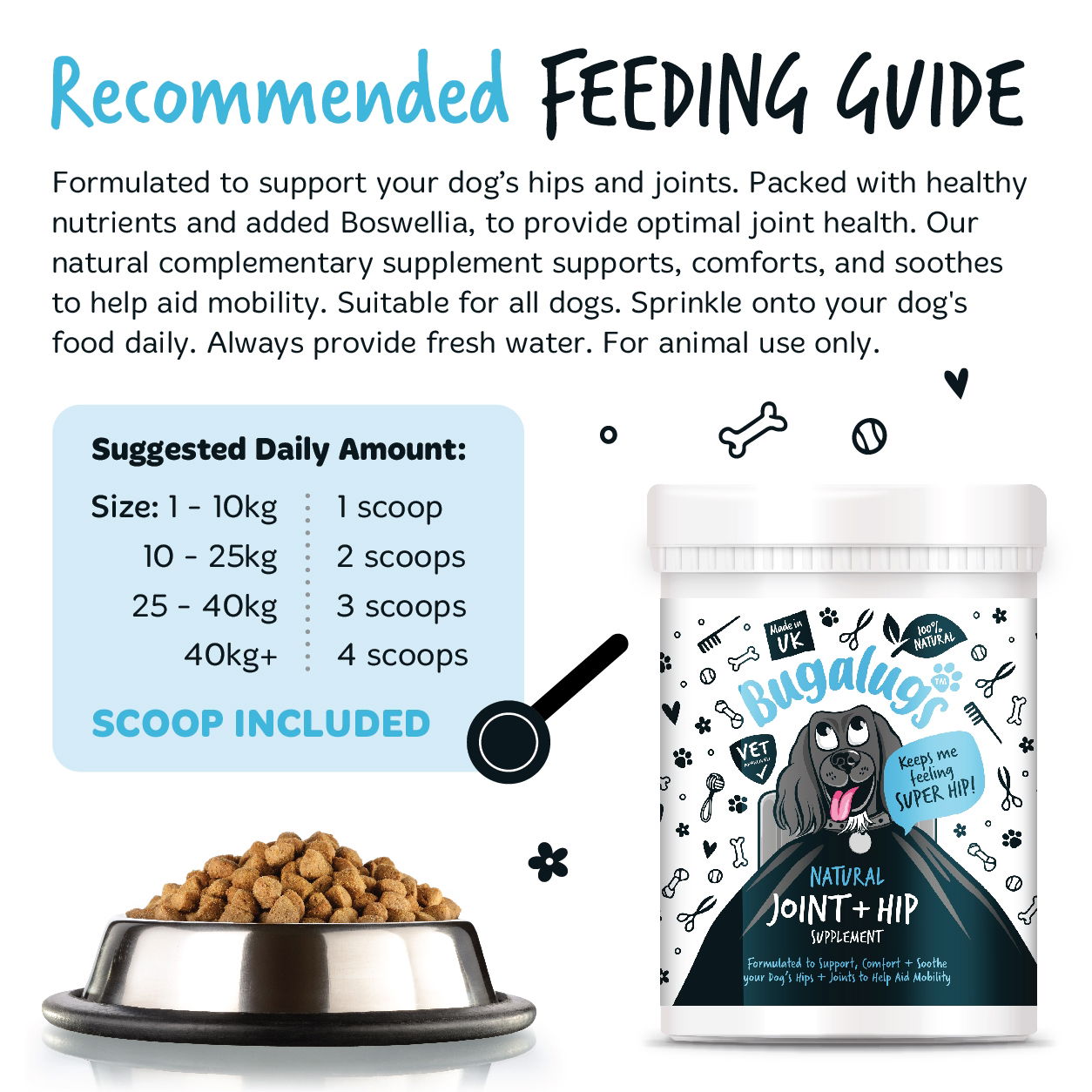 Suggested Daily Amount: Dog’s Weight Scoops per Day Up to 10kg 1 scoop 10 to 25kg 2 scoops 25 to 40kg 3 scoops 40kg + 4 scoops