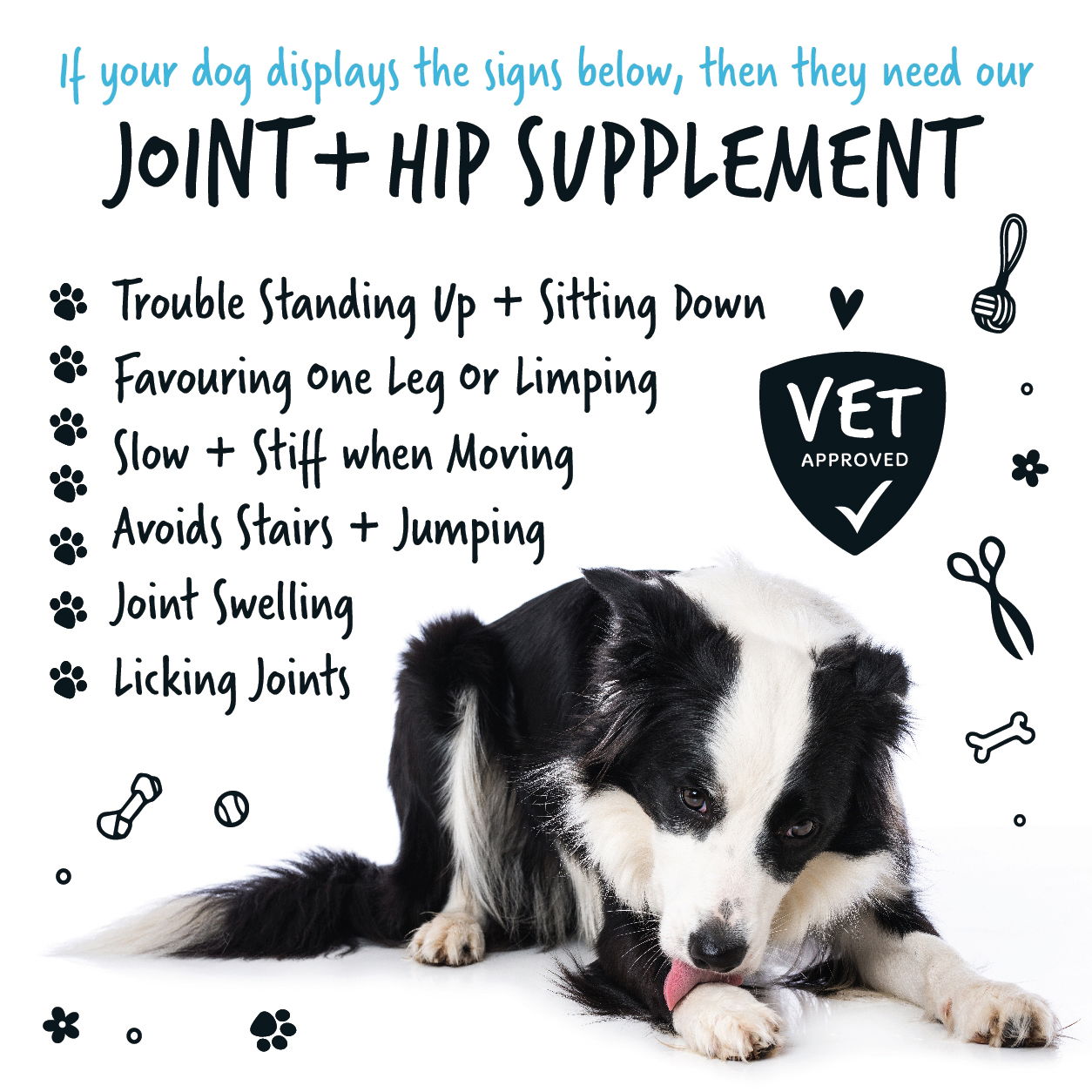 A complementary Feed for Dogs Composition: Methyl sulphonyl methane, Glucosamine (from crustacea), Mollusc meal (Green lipped mussel), Chondroitin sulphate (avian), Yeast product (Saccharomyces cerevisiae), Hyaluronic acid, Starch (from corn)