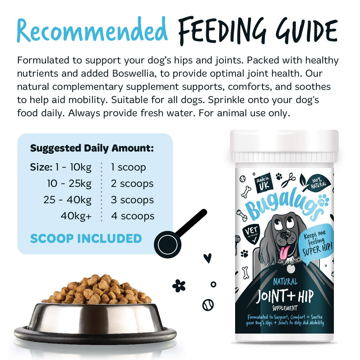 Suggested Daily Amount: Dog’s Weight Scoops per Day Up to 10kg 1 scoop 10 to 25kg 2 scoops 25 to 40kg 3 scoops 40kg + 4 scoops