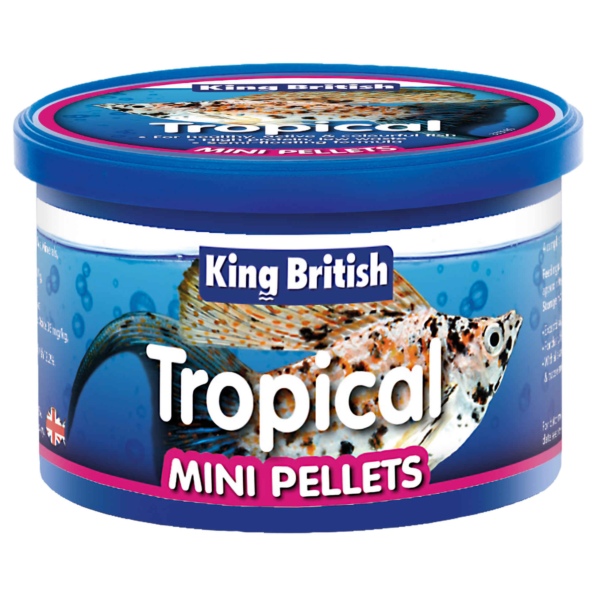 King British Tropical Fish Mini Pellets are a complete food that slowly sinks through the water column making them ideal for community tanks containing surface, mid-water and bottom feeding tropical fish. King British Tropical Fish Mini Pellets are a complete food that slowly sinks through the water column making it ideal for community tanks containing surface, mid-water and bottom feeding tropical fish. The pellets are rich with 45% protein to suit the higher metabolic rate of tropical fish species. The pellets are 1mm to 2mm across and are water-stable, meaning they remain as enticing mouth-sized chunks rather than dissolving.